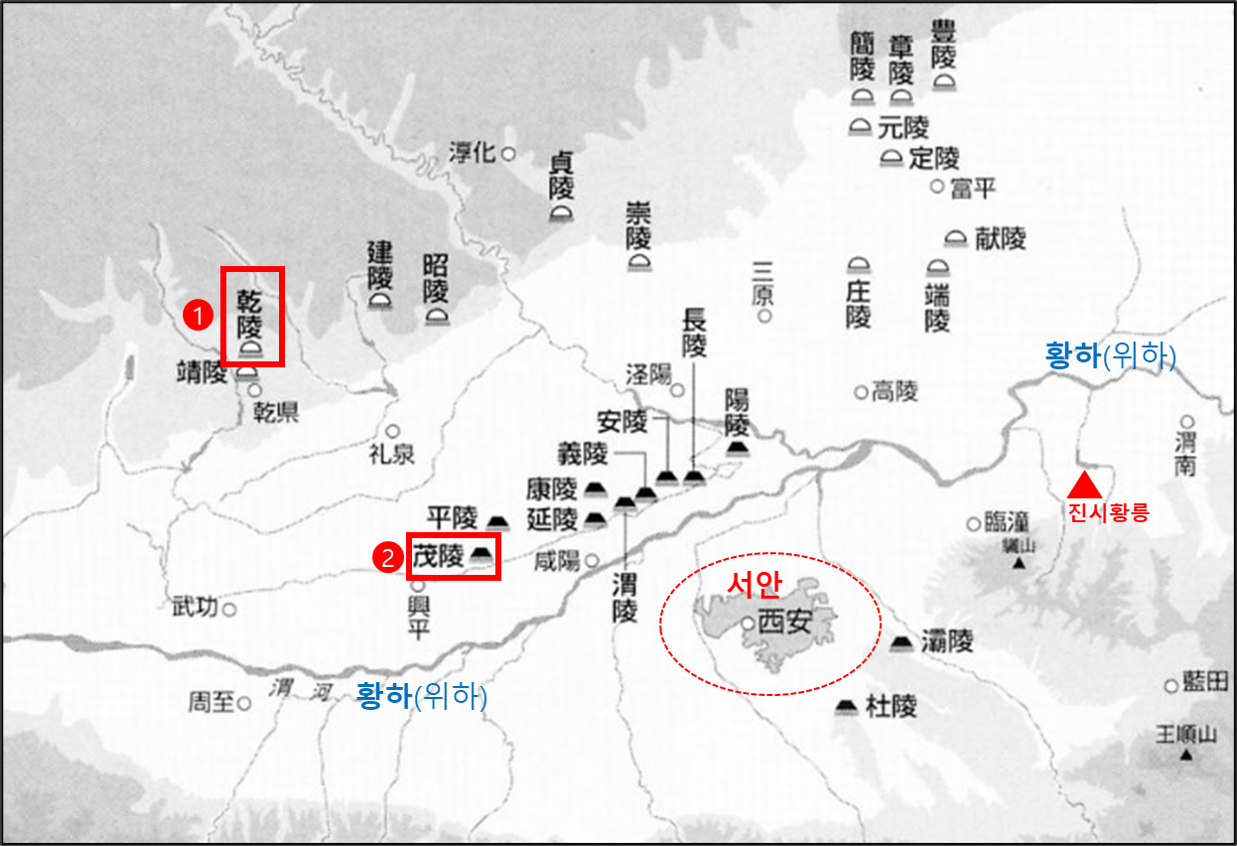 북쪽으로는 한무제의 무릉茂陵(②). 한나라 12명 황제의 능(검은색 무덤)은 함양咸陽 외곽에 있다.
