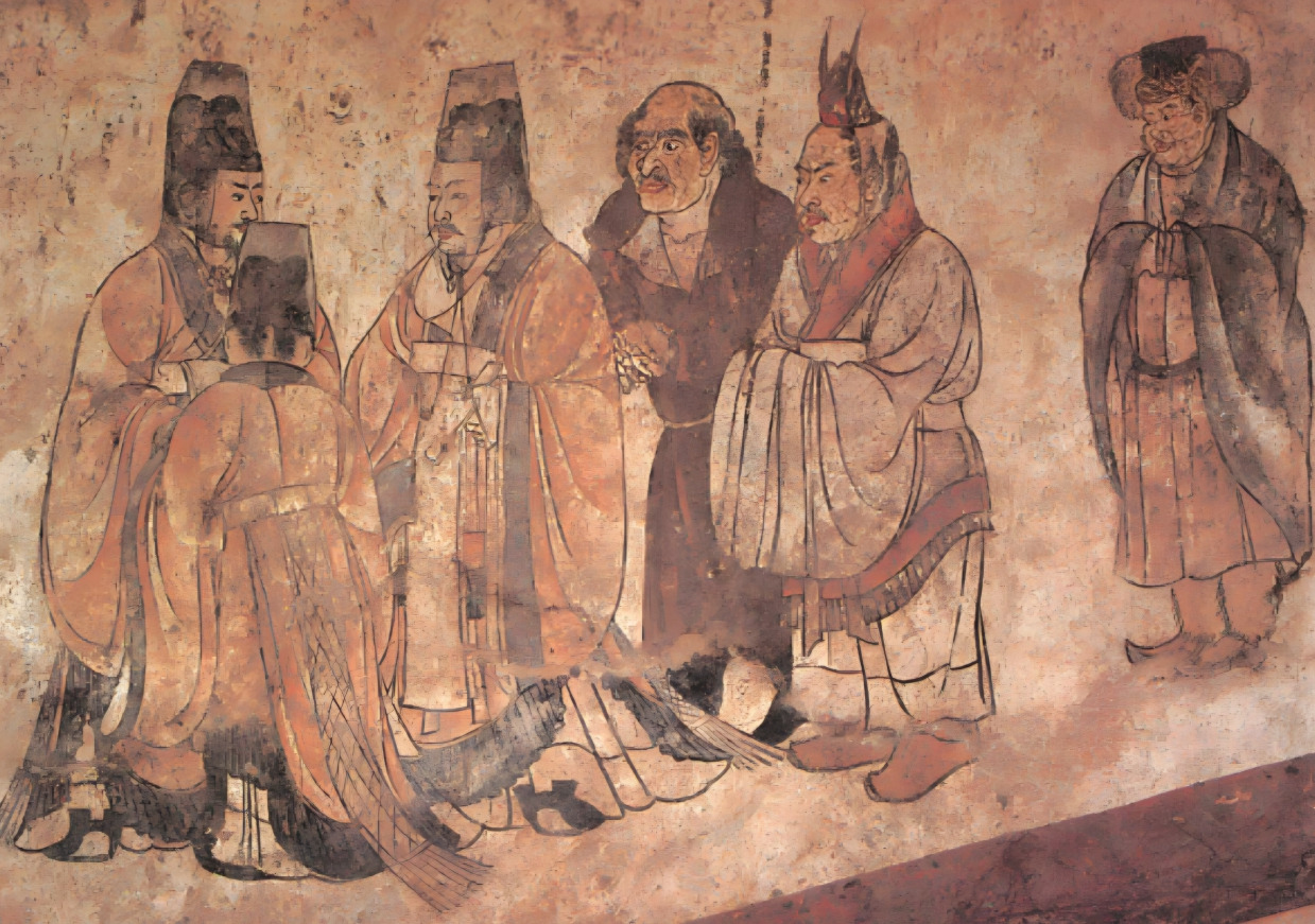 (상) 대문 그림. <객사도客使圖> 185×247mm. 좌측 3인은 당나라 관헌들. 우측 3번째는 동로마(튀르키예)의 사신. 우측 두 번째는 신라 또는 고구려 사신으로 추정. 맨 우측은 말갈 사신. 사신들을 맞이하는 외교 석상이겠지만 웬지 장회태자의 출생과 죽음의 비밀을 수군대는 것 같다. 뭐지, 뭐지? 나두 좀 알자구...