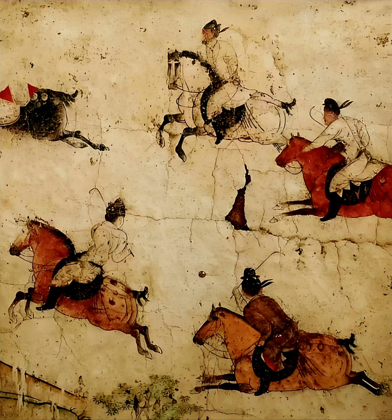 장회태자묘의 벽화. 섬서역사박물관 소장. (상) <마구도馬球圖> 일부. 마구는 당나라 황실의 공식 체육 종목이었다. 전장 8.2m. 남쪽 높이 1.7m, 북쪽 높이 2.4m. (하) <당唐 의위도儀衛圖>. '의위대'란 '의장대'를 말한다. 높이 222mm. 너비 227.5mm.