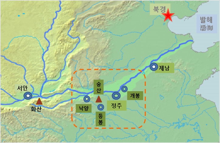 네모난 점선이 중원 지역. 이 지역은 고대의 상商(은) 나라 영역으로, 그중 정주鄭州는 교통의 요지여서 사람이 많이 모이고 장사가 발달하여, 상나라 사람 즉 상인商人이라는 말이 탄생했다.