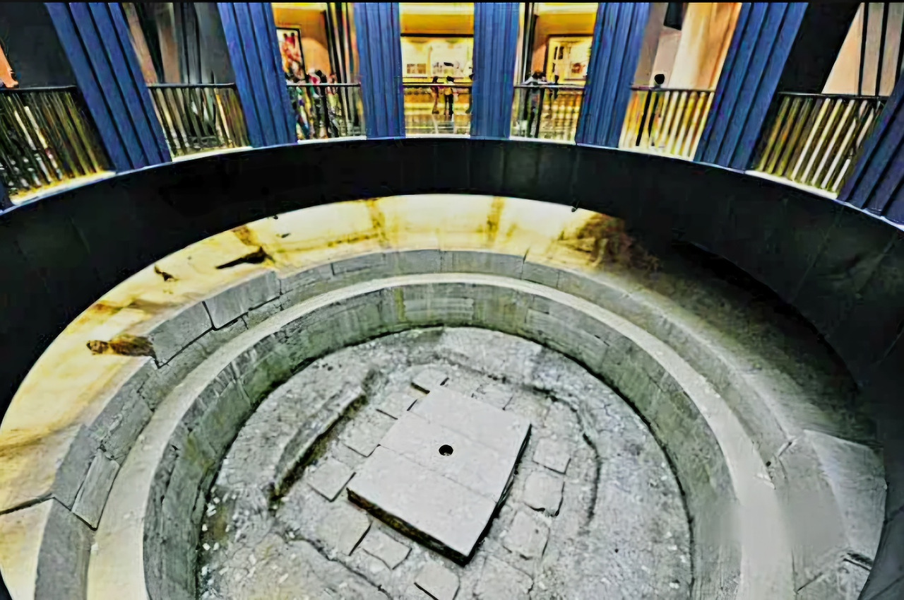 (상) 천당 내부. 무측천 당시에 높이 270m의 거대한 불상을 세웠던 기반이 발굴되었다.