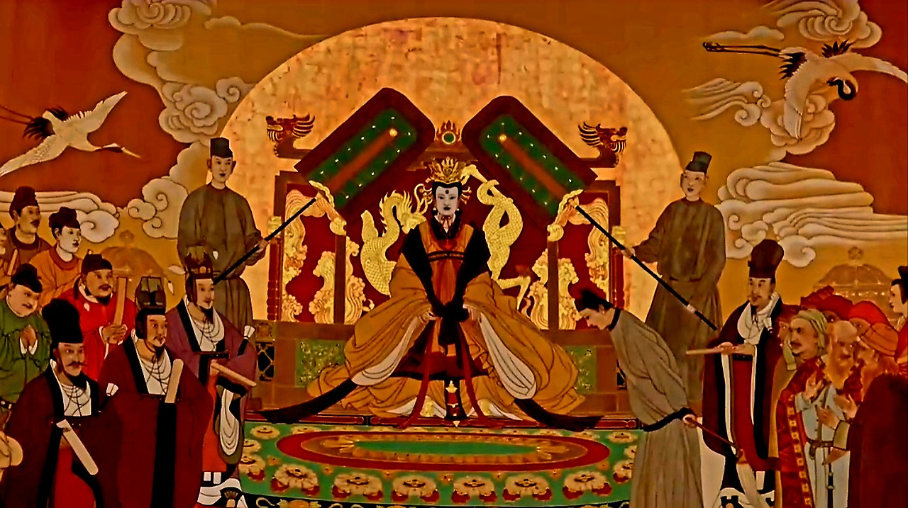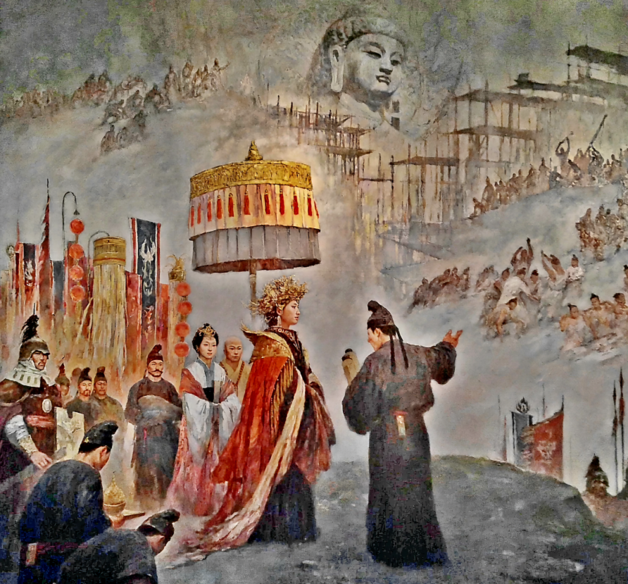 봉선사 노사나불 공사 현장을 방문하고 있는 무측천. 작가 미상. 바이두 <무측천> 항목에서 인용.