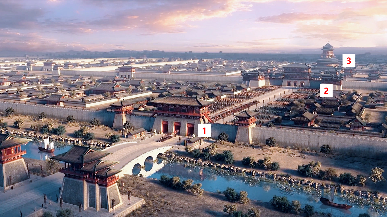 (1)은 성곽 정문인 정정문定鼎門. (2)가 황궁 정문인 응천문應天門. (3)은 명당明堂이다.