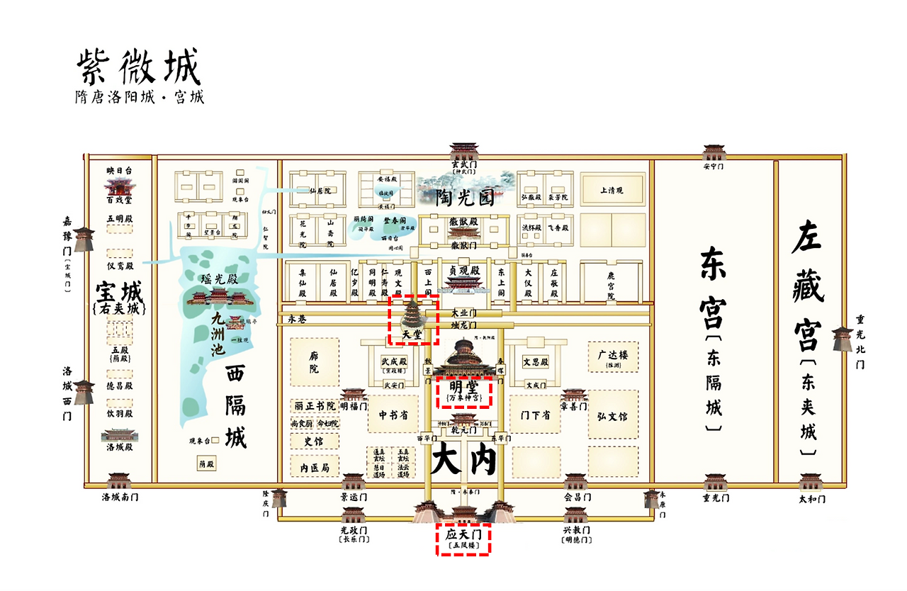 들어오니... 안내판에 옛날 무측천 당시의 자미성紫微城 상상 복원도가 있다.