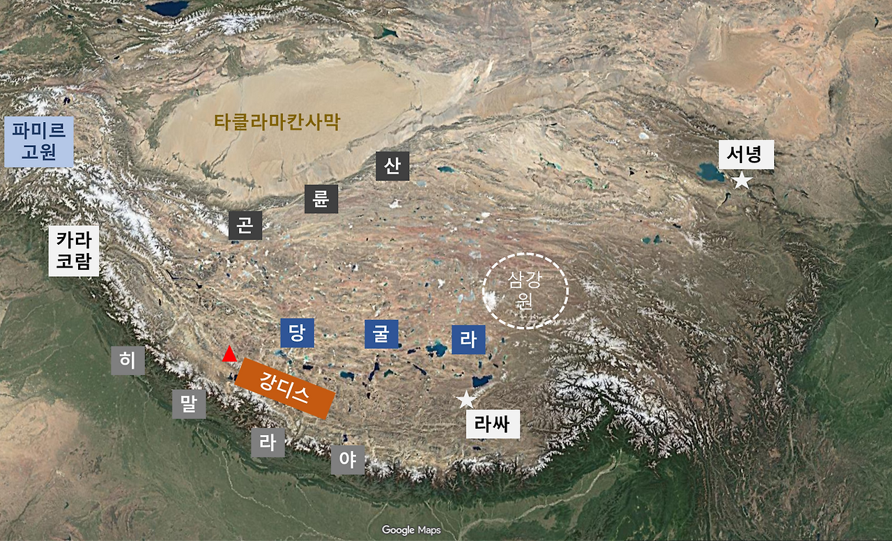 기왕 말이 나온 김에, 하나 더! 강린뽀째 산은 강디스岡底斯산맥의 시작점이기도 하거든요? 그래서 아주 드물게... 강린뽀째를 강디스라고 부르기도 한다는 사실. 그럴 수도 있겠죠? ^^;; (아래 지도 참고) 통과!
