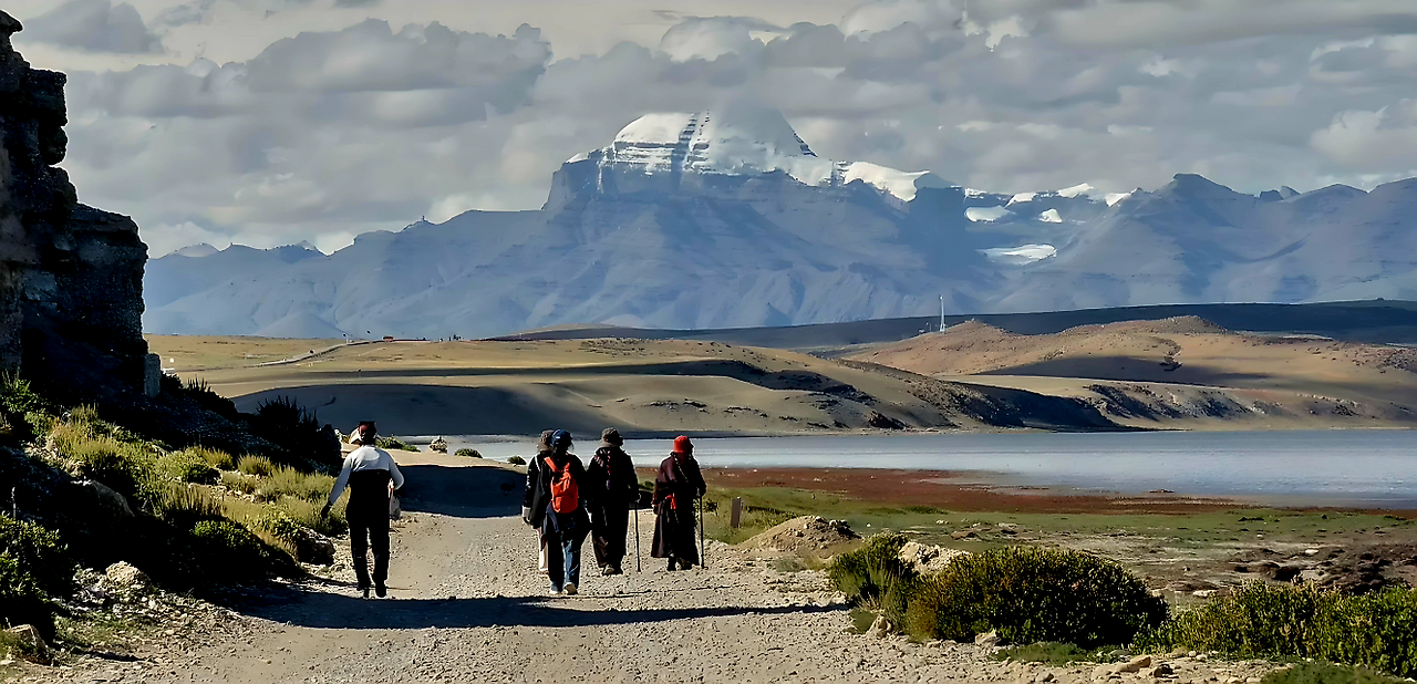 힌두교도들은 남쪽의 넓은 갠지스 평원에서 북쪽 히말라야 산맥을 올려다보며 '하늘로 올라가는 눈의 장벽'으로 여겼겠죠. 세계에서 제일 높다는 에베레스트로 가는 길은 너무 험해서 접근조차 힘들었고 인도 평원에서는 거의 보이지도 않았을 거예요. 반면 카일라스로 가는 길은 히말라야 중에서는 상대적으로 넘기가 수월해서, 아주 드물게나마 어떤 이들은 그 '눈의 장벽'을 넘어갔던 모양예요.