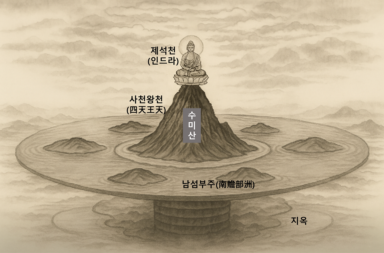 (3) 산 밑은 바다. 인간 · 동물 · 아귀 · 지옥 등 육도윤회의 세계예여~ 동서남북 네 방향으로 네 개의 대륙이 둘러싸고 있는데여~ 그중에서 남쪽의 남섬부주南贍部洲가 우리가 사는 인간 세계래여. 재밌져? ㅋㅋ