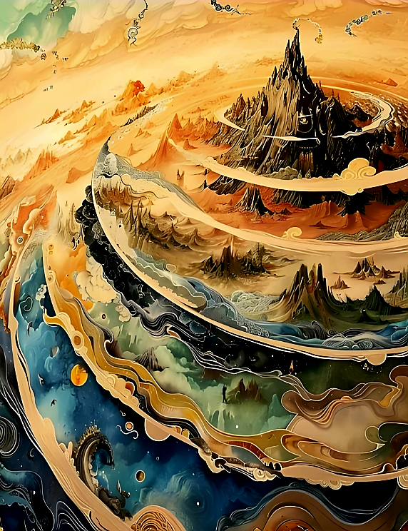 어때여? 심플하게 잘 그렸져? 헤헤. 음... 불경을 보면... 산의 중심부는 칠보(七寶; 금·은·유리·수정·산호·호박·진주)로 장식되어 있어서 찬란하게 빛난다는데... 아마도 히말라야 주변의 동심원형 산맥 구조를 상징하는 것 아닌가 싶어여~ 근데 그걸 표현하려니깐 AI가 통 협조를 안 하네여? 그냥 생략했으니깐 마음의 눈으로 보시어여? ㅋㅋㅋ