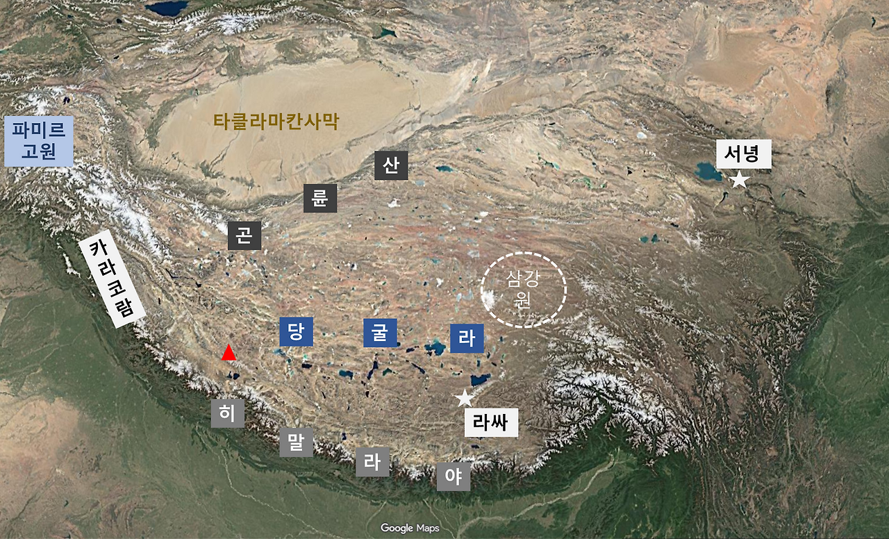 (2) 인버터(inverter)의 역할. 당굴라는 수미산의 강렬한 기氣를 생명의 물로 전환하여 동방세계로 전달해주는 역할을 담당하고 있습니다. 당굴라는 티베트고원의 한가운데를 동서 방향으로 약 700~800km 정도 뻗어있는데요, 서쪽 끝은 수미산(강린뽀째)이고 동쪽 끝은 삼강원(三江源, Three Rivers Headwaters)이라고 할 수 있답니다. 아래 지도에서 그 위치를 확인하며 당굴라의 역할을 음미해 보시죠.