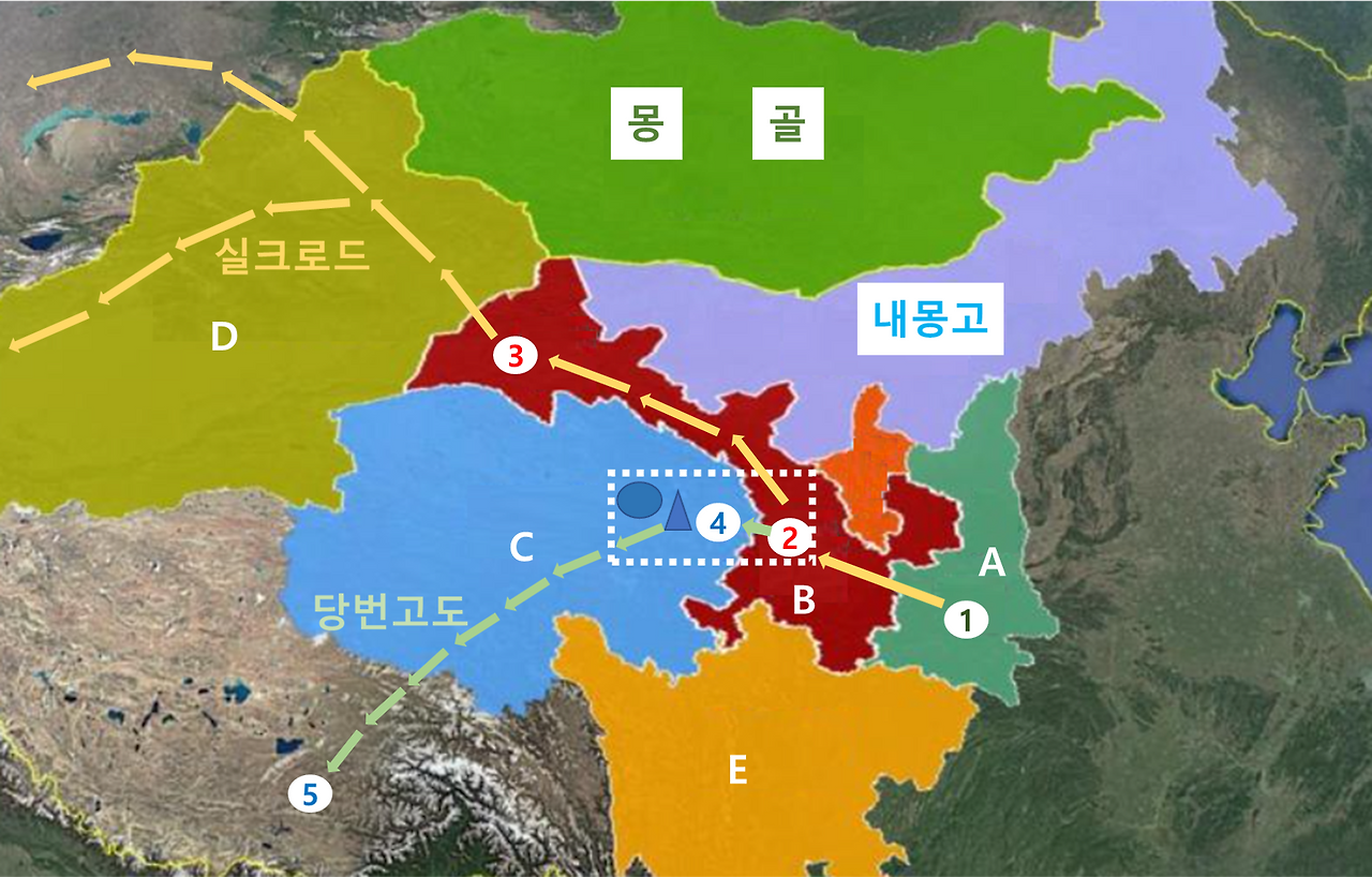 ①장안(서안, 섬서성의 수도) ②난주(감숙성의 수도) ③돈황 ④서녕(청해성의 수도) ⑤라싸
