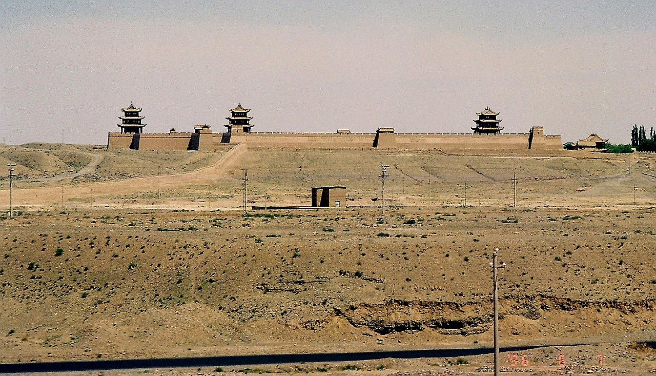 (상) 기련산맥. 난주에서 열차를 타고 가면 왼쪽에 1,000km가 넘도록 이런 풍광이 거의 똑같은 모습으로 나타난다. (하) 오른쪽으로는 황량한 고비사막이 끝없이 펼쳐지다가 20여 시간이 지나면 비로소 다른 풍광이 나타난다. 만리장성의 서쪽 끝 관문, 가욕관이다. (96.6.7.) 돈황까지 이어지는 이 길을 하서주랑이라고 한다.