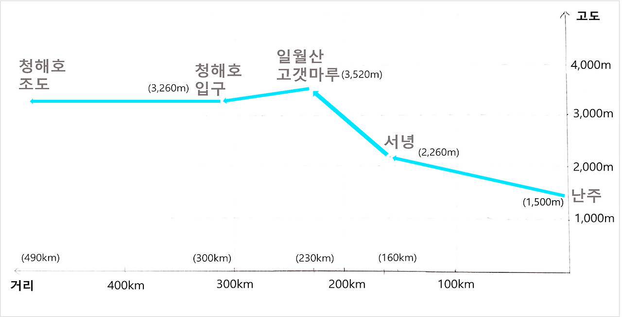 서녕西寧에 대해서도 알아볼까요? 서녕은 해발 2,260m의 고원 도시예요. 티베트고원의 문턱인 일월산(해발 4,877m) 자락에 있죠. 하지만 고도가 아주 완만하게 올라가서 서녕을 처음 찾는 여행객들은 여기가 한라산보다 더 높은 곳이라는 걸 전혀 눈치채지 못한답니다. 고산병 증세도 해발 3,000m에서나 나타나니까요. 참고로 이 일대의 고도는 아래 도표와 같습니다.