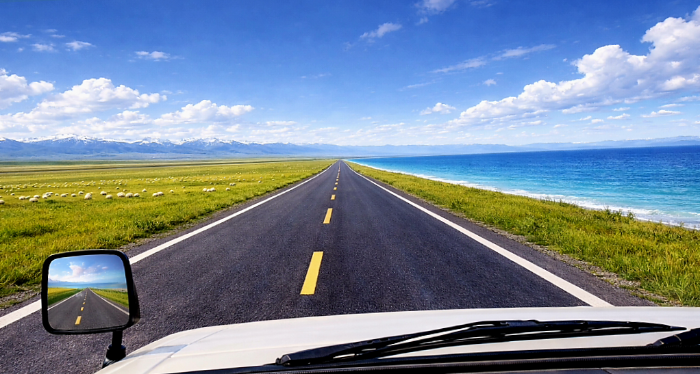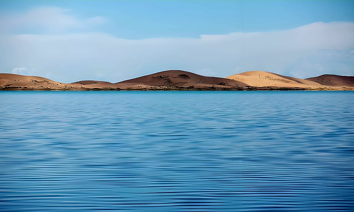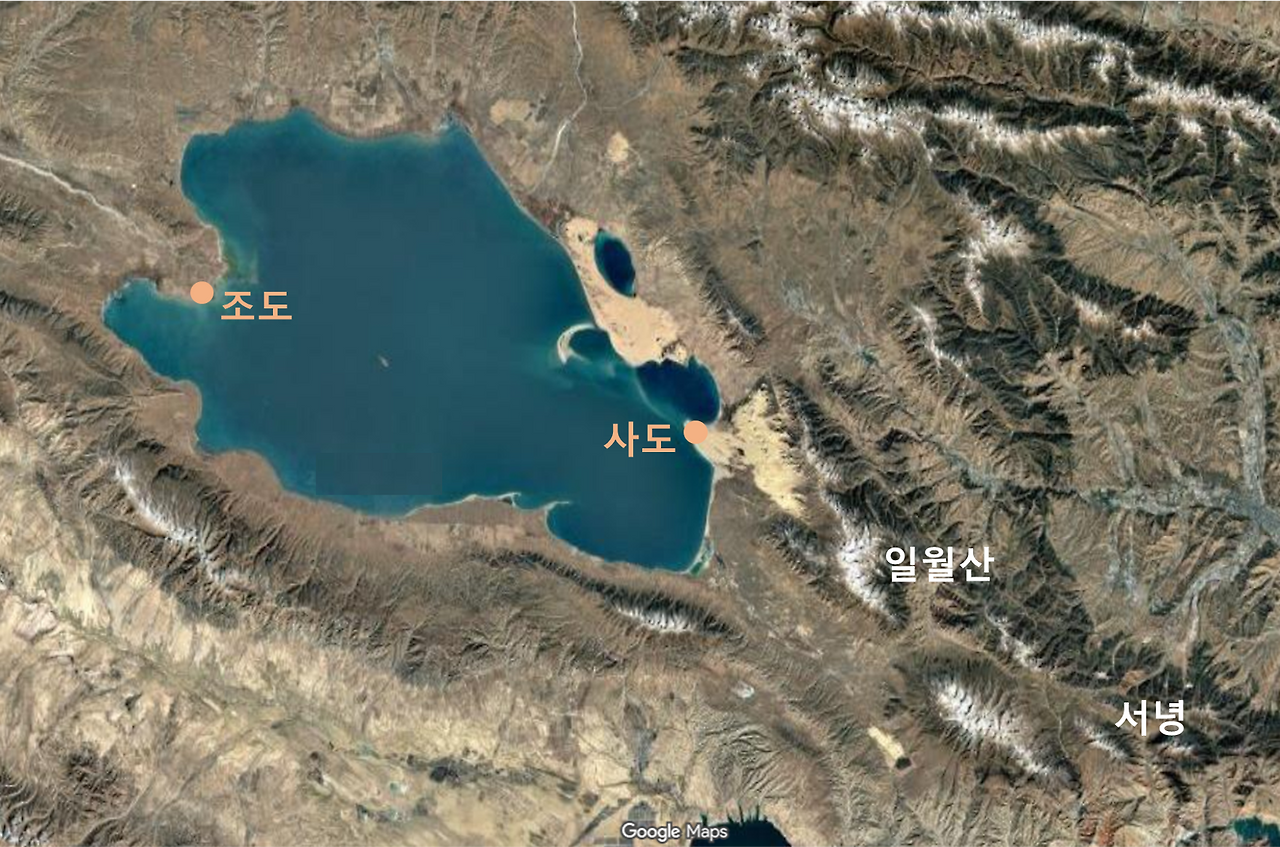 (상) AI 생성 이미지. (하) 청해호. 해발 3,260m. 둘레는 약 360km. 면적은 약 4,400㎢로 경기도의 절반 넓이다. 사막으로 이루어진 사도沙島와 철새 서식지인 조도鳥島가 있다. 실제 섬은 아니다.