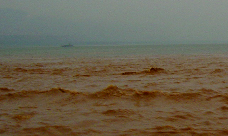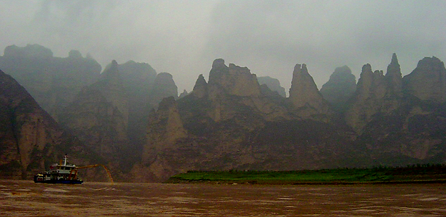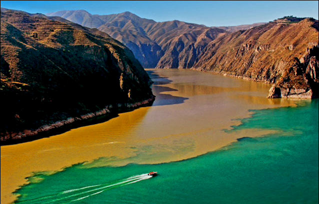 (좌) 유가협. 마튜가 황토고원을 지나온 탁한 물과 만나는 장면. 출처: 《중국국가지리》(우) 유가협. 마튜가 황하로 변신하는 순간. 폭우 속에서 병령사로 가는 모터보트에서 찍은 장면이다. 2005. 7. 1.