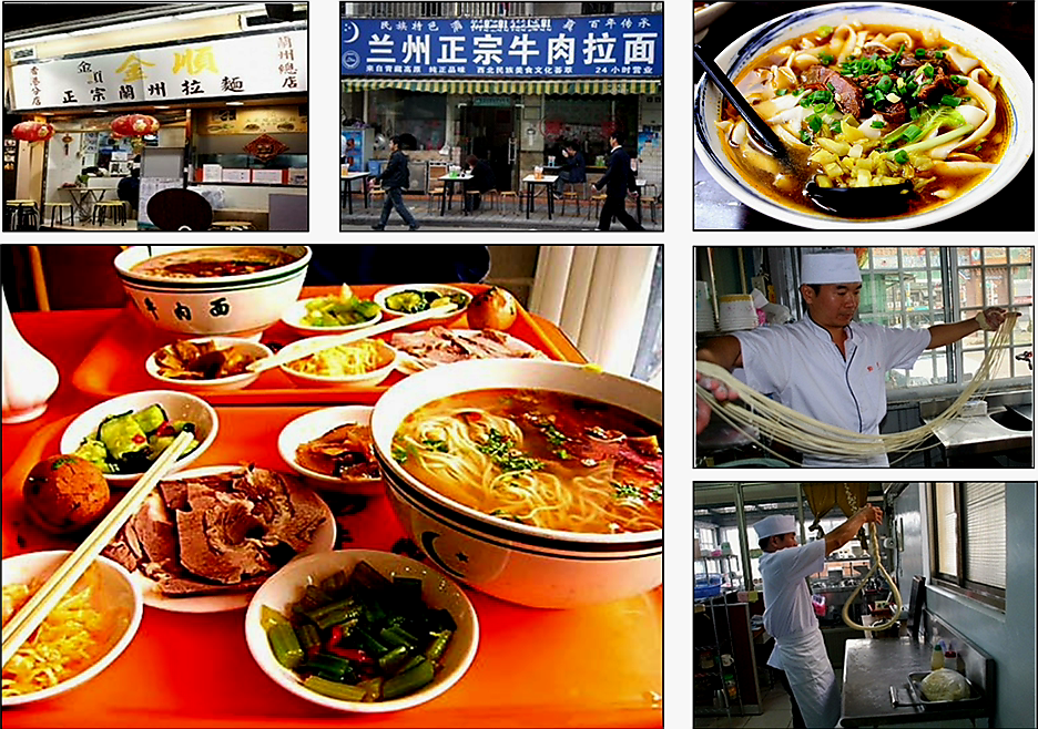 (상) 난주 시내를 가로지르는 황하. (하) 난주는 '라면(拉麵, 라/미엔)'이란 단어가 최초로 탄생한 곳이다. '(즉석에서 손으로) 뽑아낸 면'이라는 뜻. 청결을 중시하는 이슬람의 대표 음식이다. 빠르고 든든한 먹거리를 요구했던 실크로드 상인들에게는 손으로 늘려 즉시 조리하는 라면이 최적이었다. 사진 출처: 바이두.