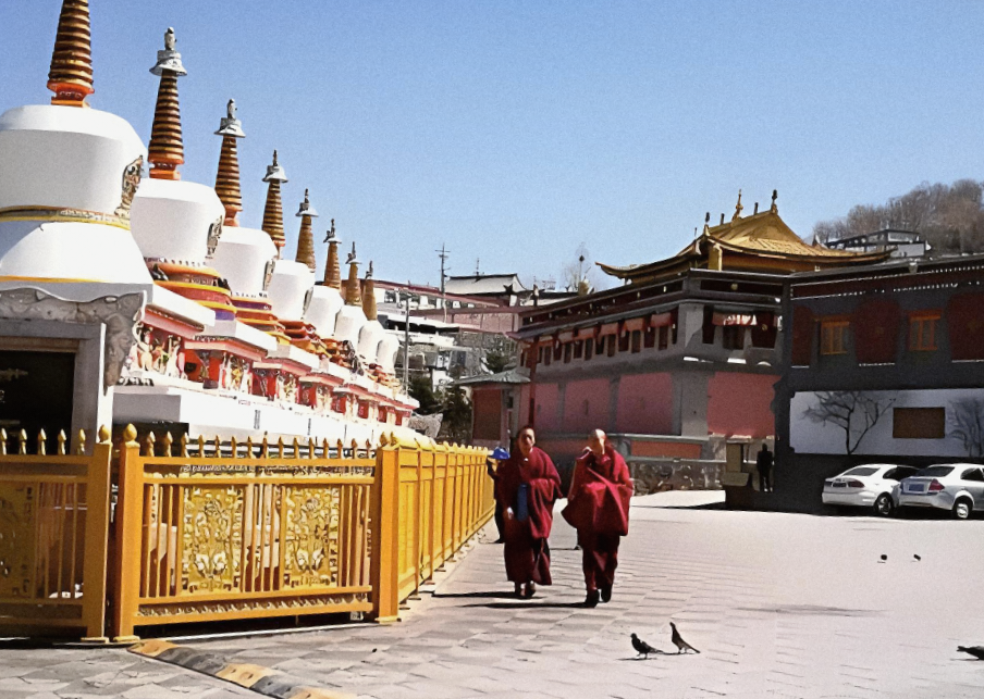 그러다가 1379년이 되자 이 지역에 강력한 '라캉(lhakhang, 사원)'이 건립되었답니다. 오늘날 탑이사塔尔寺, 중국어 발음으로는 타(↗)얼(↓)쓰(↘)[Tǎ'ěrsì]라고 부르는 사원이죠. 드디어 '뽄(지방 권력)'과 '라캉(사원)이 만난 겁니다.