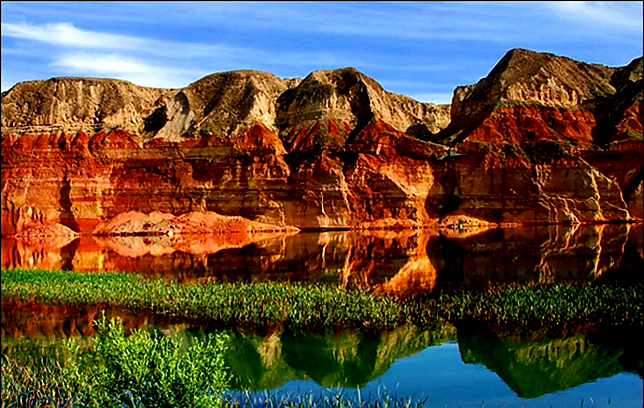 그런데 더 신기한 것은... 민둥산과 사막 사이, 기차가 달리는 선로를 중심으로 폭 20~60km 남짓한 한 줄기의 가느다란 녹색 띠가 끝없이 이어져 있다는 사실입니다. 나무가 있다는 것은 바로 물이 있다는 뜻이겠죠? 1,000km 넘게 이어지는 지하 수로, 카레즈(Karez, 坎儿井) 덕분입니다.