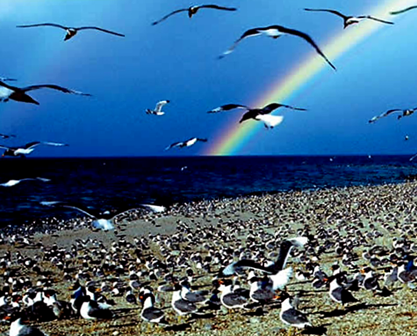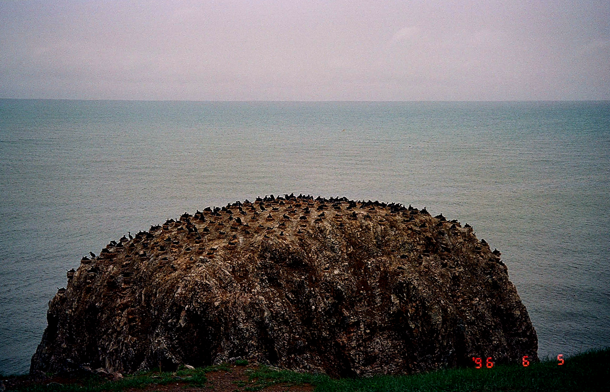 (좌상) 철새들의 천국, 조도. 조류 독감 때문에 자주 폐쇄된다. 사진 출처: 바이두. (우상/좌하) 갑자기 몰아친 혹한에 새들이 어디론가 자취를 감췄다. (우하) 바위 위에 일부만 보인다. 96. 6. 5.