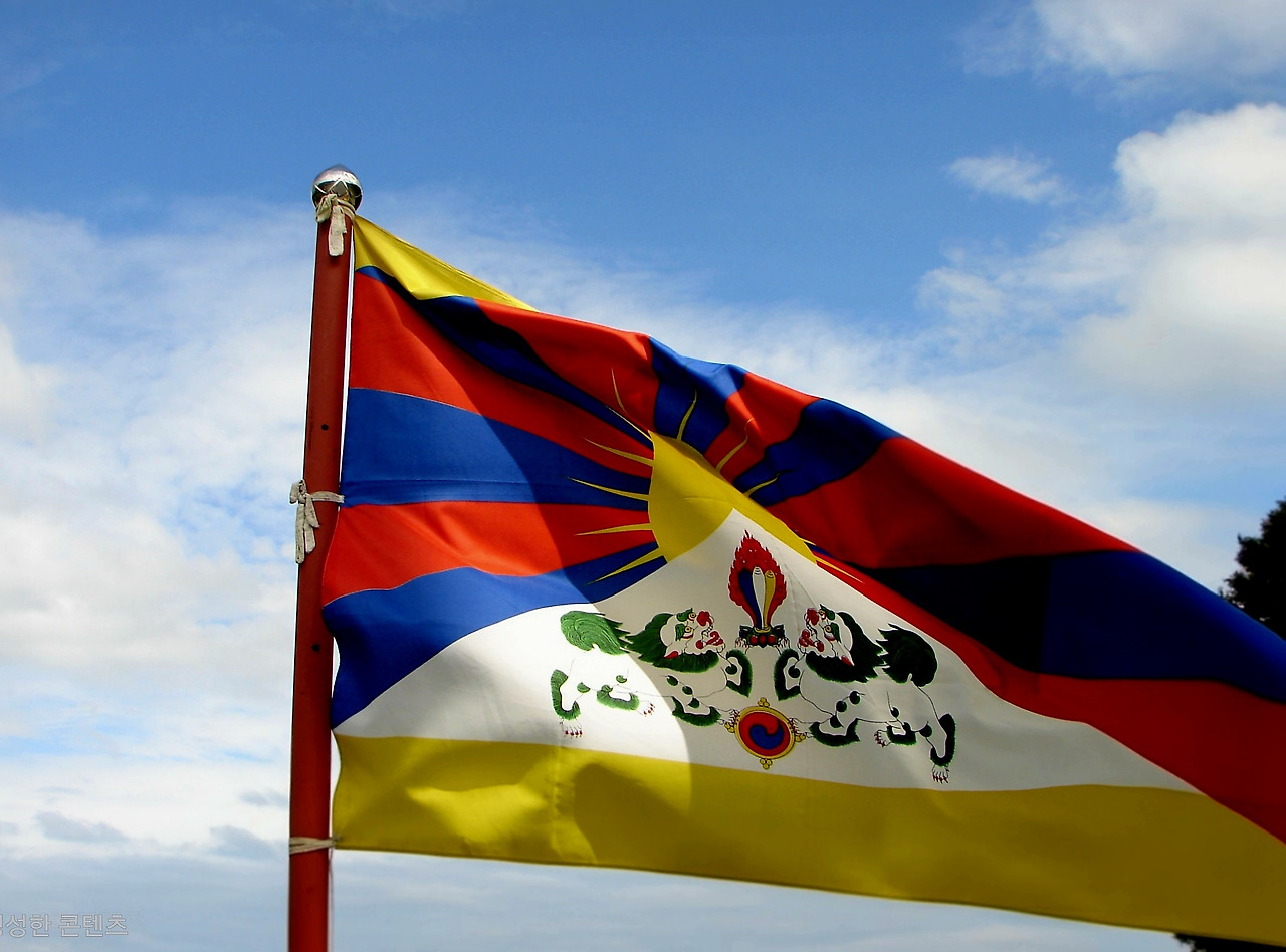 대한민국의 상징은 태극기입니다. 그렇겠죠? 티베트에도 국기가 있습니다. 1947년에 제정한 '설산사자기雪山獅子旗'이죠. 아래의 사진처럼... 해와 달이 동시에 떠있고, 눈 덮인 산 위에서 사자가 법륜法輪을 떠받들고 있는 모습입니다.