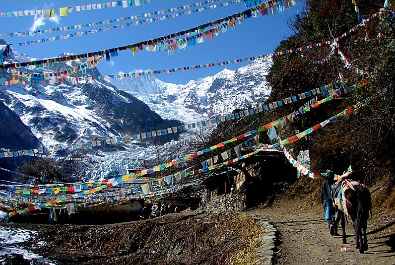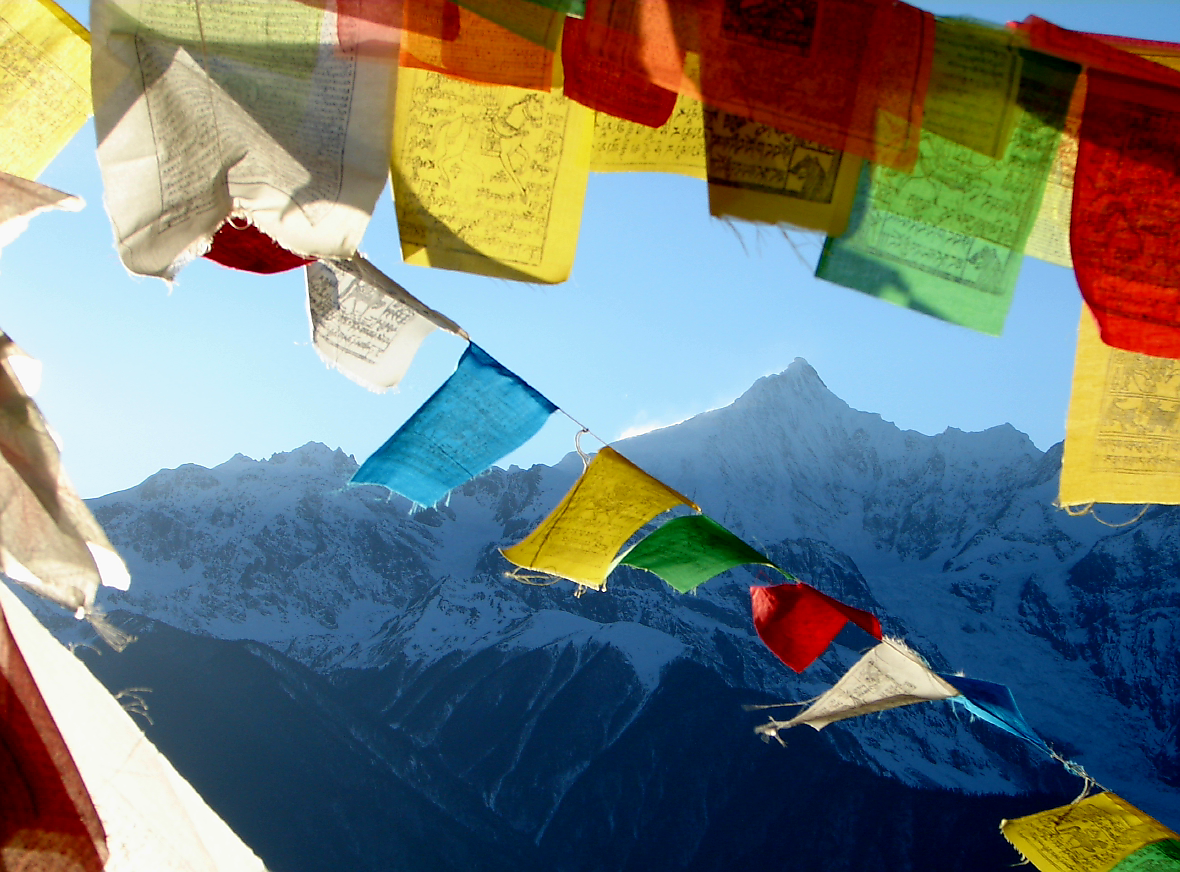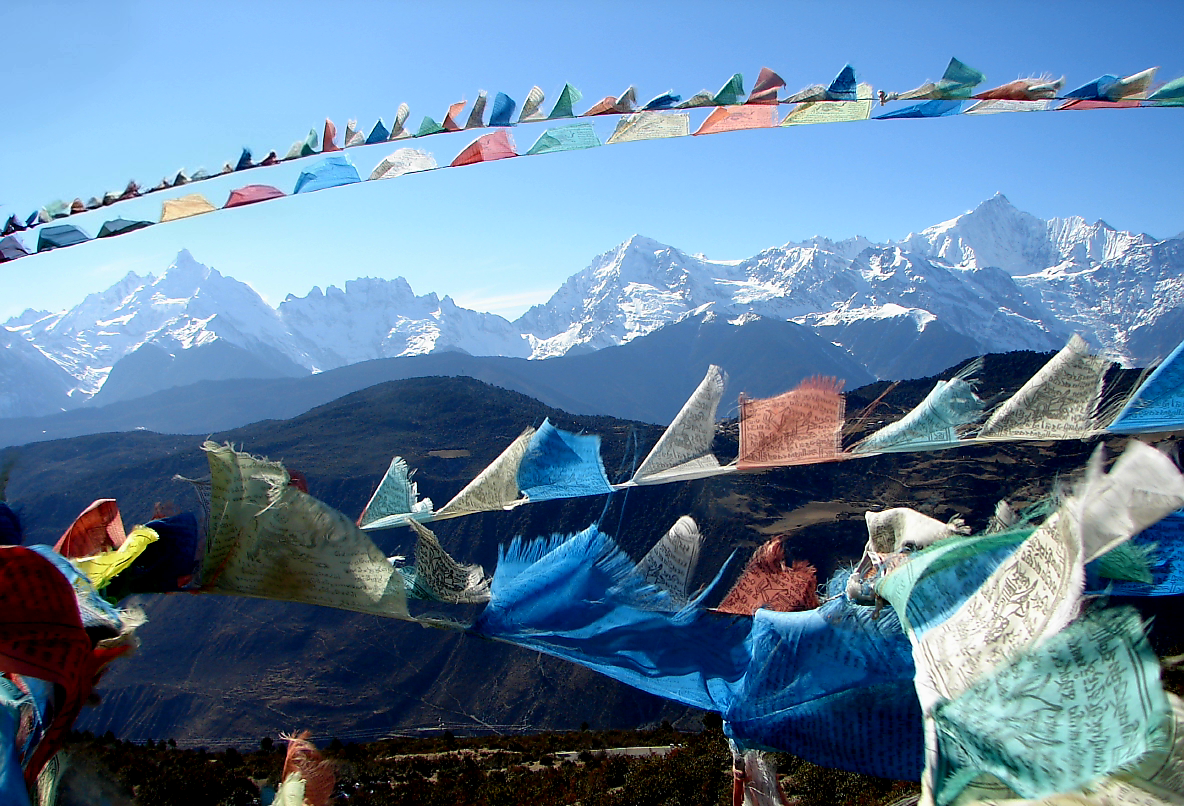 메이리설산 카와거버 봉우리(6,740m)의 하얀 설산을 배경으로 알록달록 오방색으로 펼쳐진 다르쪽의 향연.