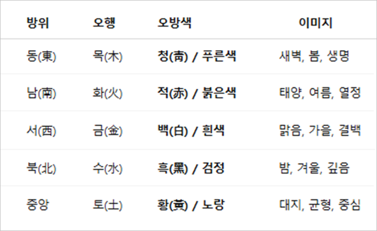 (소오생) 아 그럼 오방색이 무엇인지 그것부터 설명을 드릴까요? 오방색이란 고대 동아시아인들이 우주의 구성과 운행원리로 믿었던 오행五行 사상을 색깔, colour와 접목한 이론이에요. 아래의 표를 보실까요?