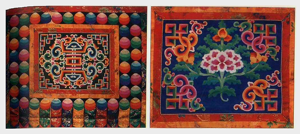 (좌) 티베트 전통 의복. (우) 오방색으로 그린 만다라. 뵌뽀교의 칼라 우주 지도다. 텐진 남닥,《본교(苯敎)의 만다라》 오사카 국립민족학박물관. 2000.