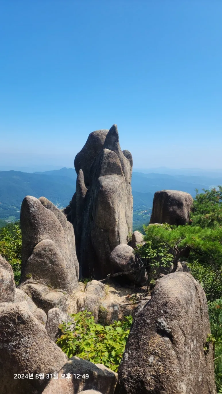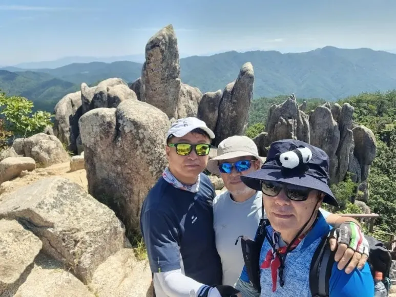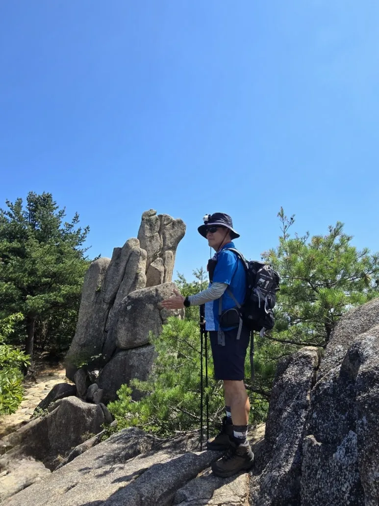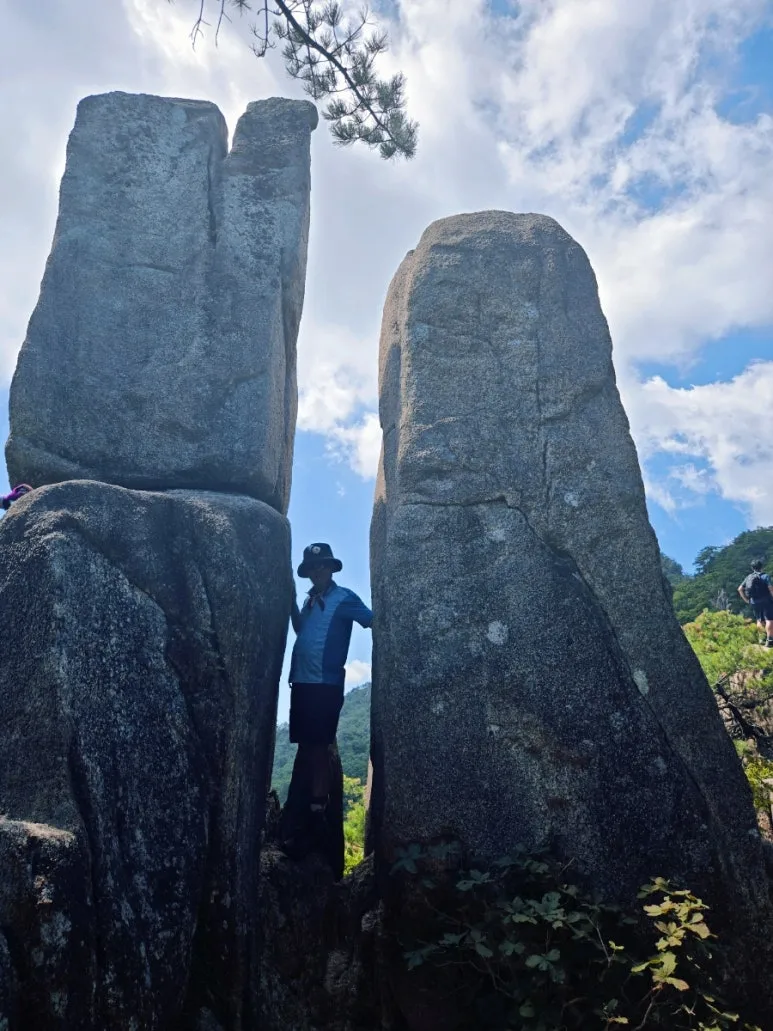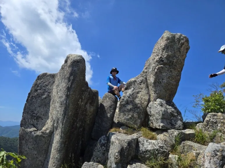이곳에서 멋진 사진을 남기기 위해 함께 산행했던 여자 산우 한 명이 두 개의 바위 사이에 있는 작은 바위에 올라서려다 미끄러져 뒤로 넘어졌다. 바로 앞에 서있었던 나는 넘어지는 여자 산우의 머리가 바위에 부딪치지 않도록 머리를 두 손으로 재빨리 받쳐서 보호했다. 지난봄 백아산 산행 때 함께 했던 산우가 바위에서 미끄러지면서 넘어져서 크게 다졌던 기억이 주마등처럼 스쳐 지나가는 아찔한 순간이었다. 그 덕분인지 다행히 크게 다치지는 않았다.
