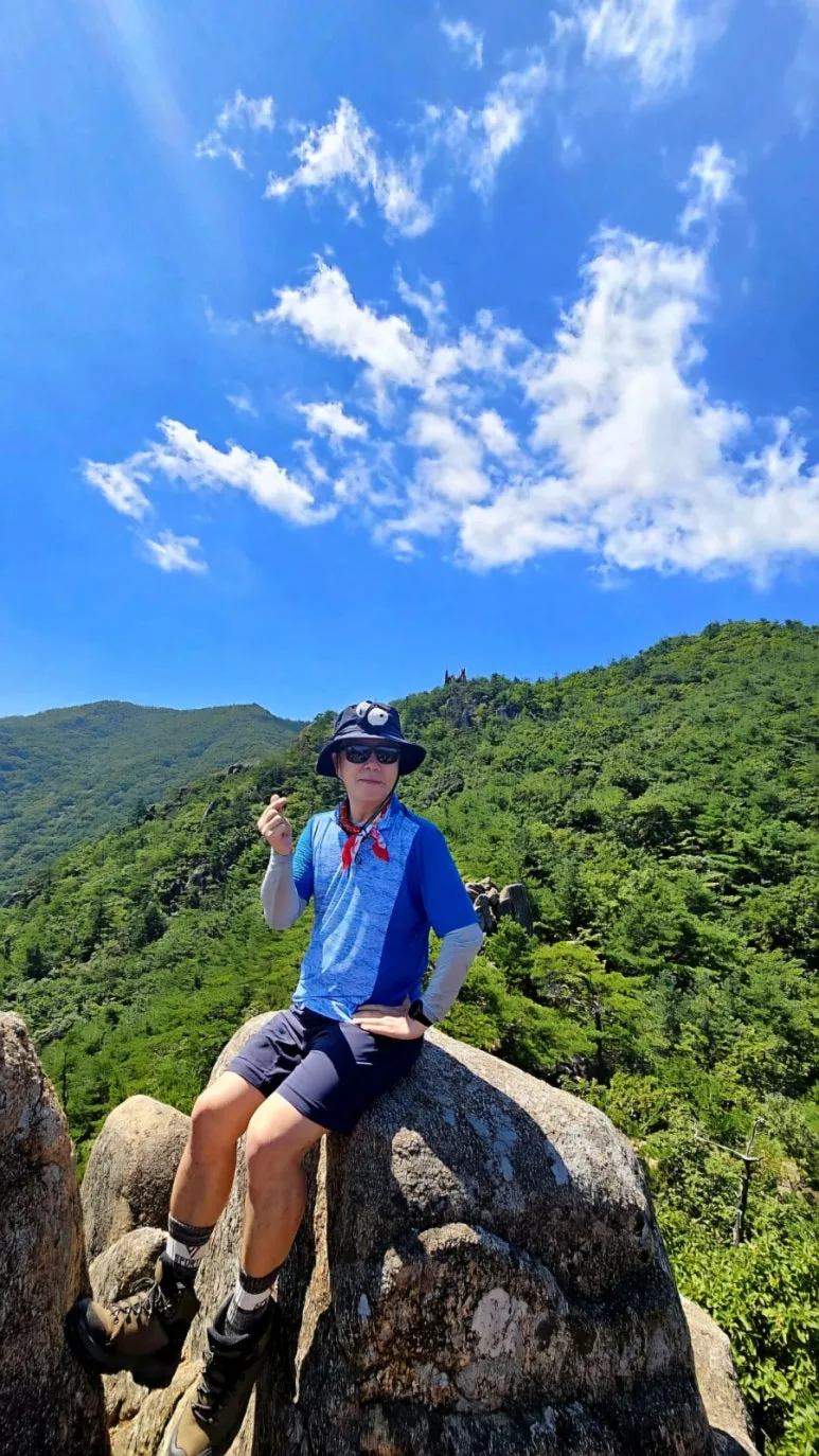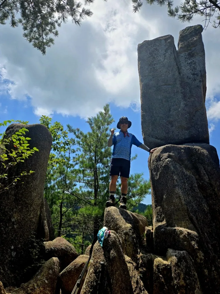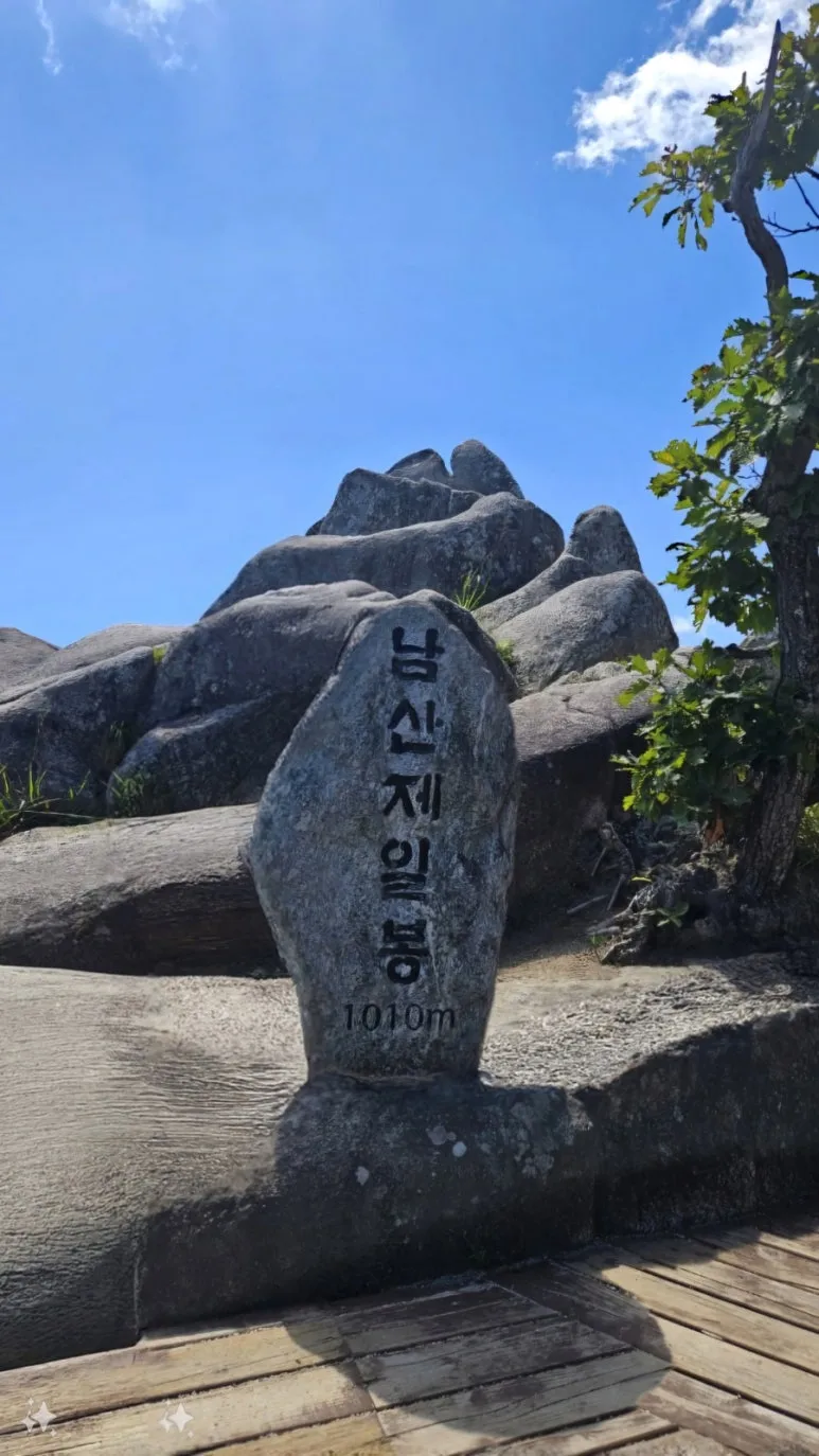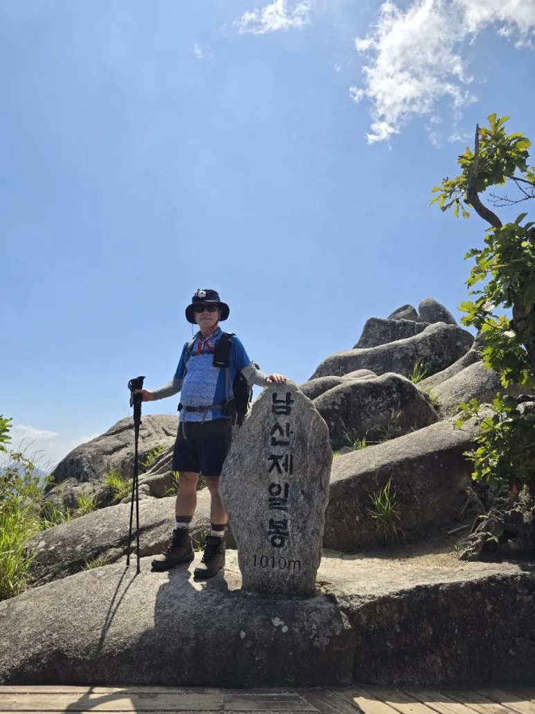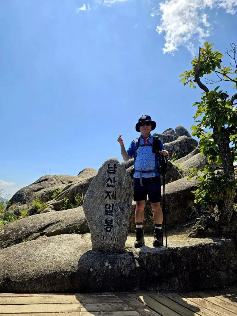 남산제일봉 장상에 가기 위한 철제 계단을 오르면서 남산제일봉 정상으로 연결되는 급경사의 철제 계단을 오르자 남산제일봉 정상석이 맞이하여 주었다. 정상에는 기기묘묘한 모양의 바위들이 자신들의 자태를 뽐내고 있었다. 어디를 서든 그곳이 바로 남산제일봉의 포토존이었고, 어디를 봐도 그곳이 남산제일봉의 멋진 조망이었다. 아직 날씨는 무더운 여름이었지만 군데군데 흰구름이 수놓은 맑고 파란 가을 하늘을 배경으로 삼아 남산제일봉의 정상의 바위에 올라 마음껏 포즈를 잡고 열심히 멋진 사진을 찍고 또 찍었다. 마치 정상석을 딛고 올라선 것처럼 보이게 하는 요즘의 가장 핫한 포즈로 인생 사진을 남겼다. 독고 형님과 독고 형님 을과도 사진을 남긴 후 등산길에 비해 수월한 돼지골 탐방로 방향으로 하산하였다.