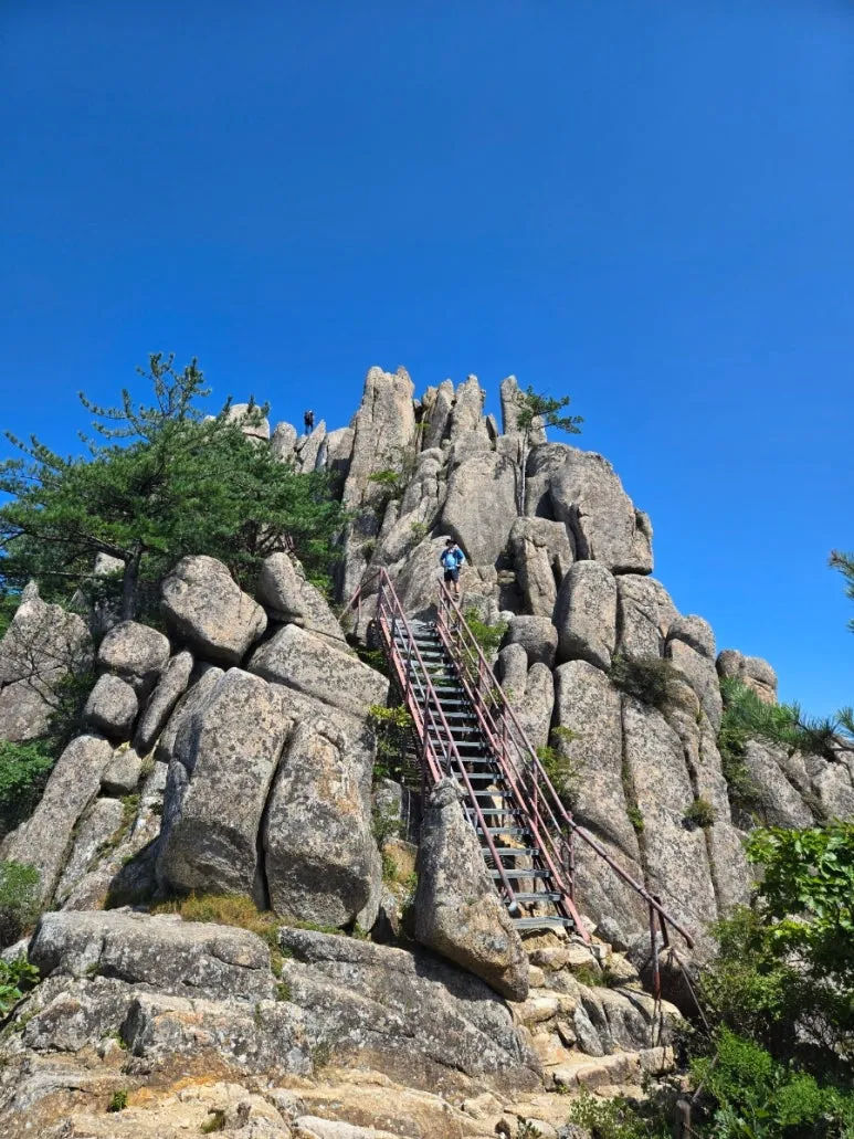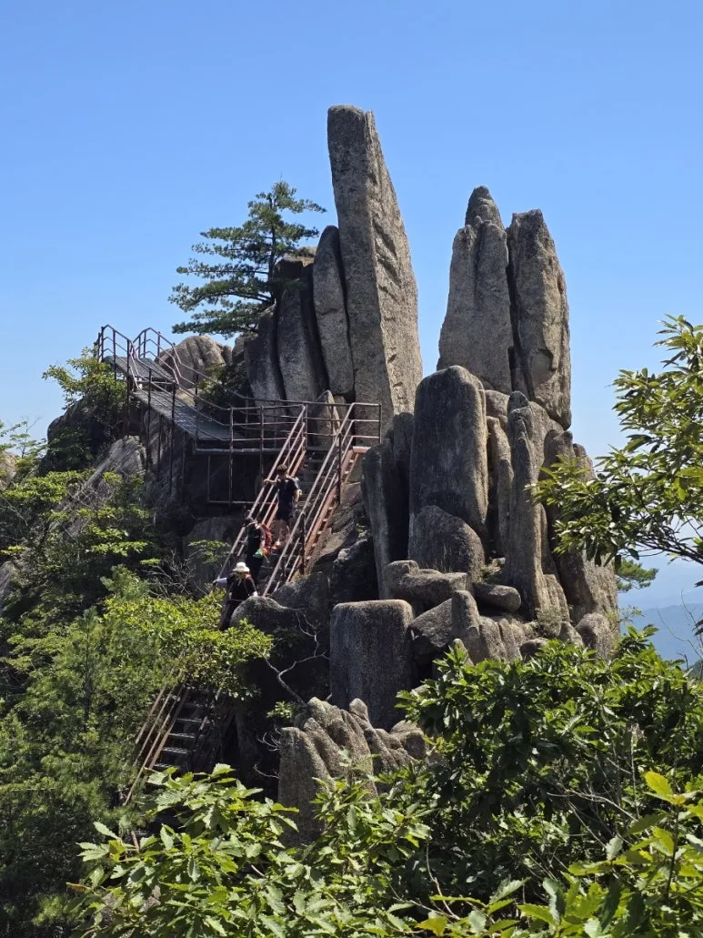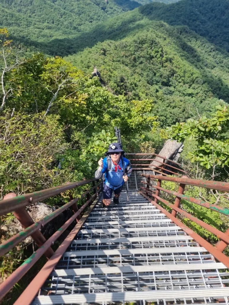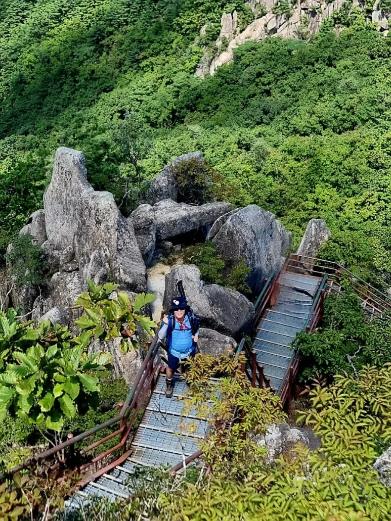 가위바위보 바위 앞에서 가위바위보 바위에서 정상 가는 도중에 공룡바위를 지나면서 멋진 바위를 배경으로 인증 사진을 남기고 정상 방향으로 10여 분 오르자 길고도 긴 가파른 급경사의 철제 계단이 기다리고 있었다. 돼지골 탐방로에서 정상을 향해 출발하여 먼저 도착한 산우들이 정상을 향해 급경사의 철제 계단을 오르는 청량동탐방로에서 출발한 우리들을 정상에서 반겨주었다.