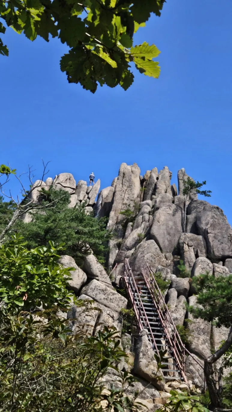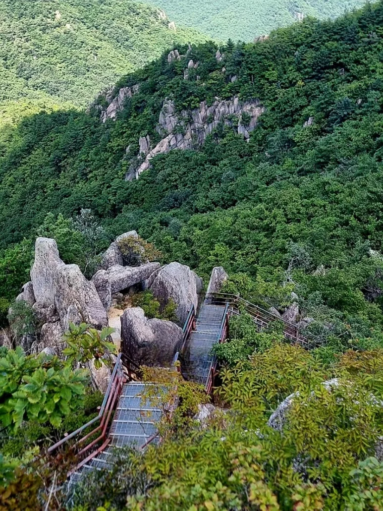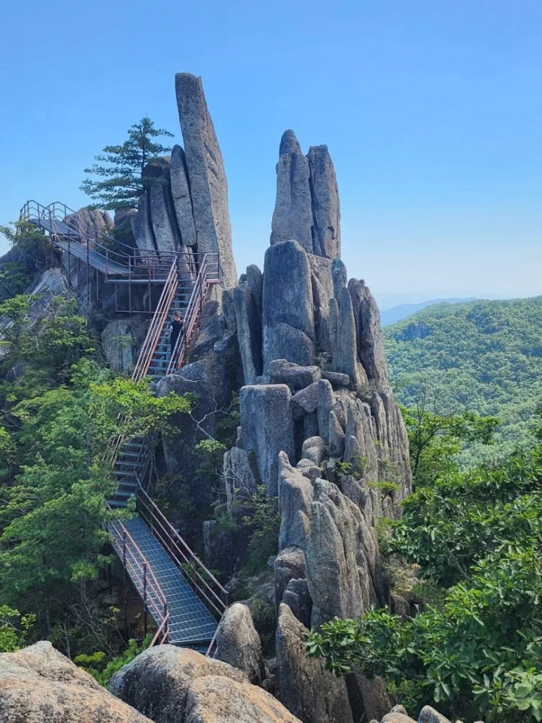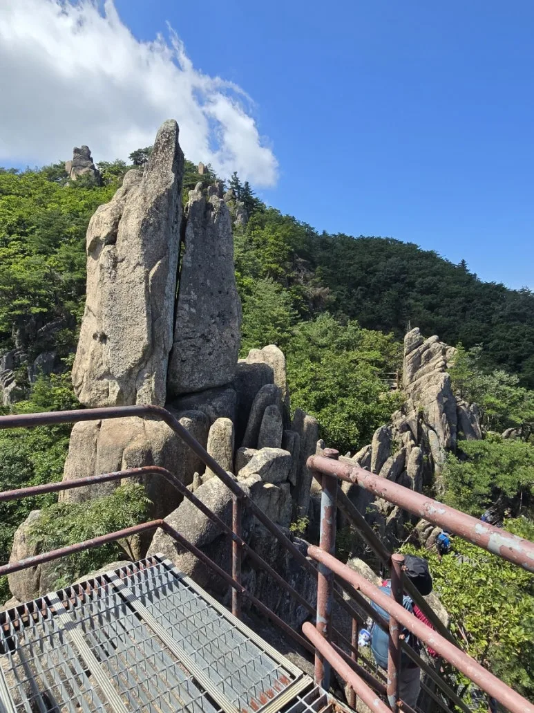 가위바위보 바위 앞에서 가위바위보 바위에서 정상 가는 도중에 공룡바위를 지나면서 멋진 바위를 배경으로 인증 사진을 남기고 정상 방향으로 10여 분 오르자 길고도 긴 가파른 급경사의 철제 계단이 기다리고 있었다. 돼지골 탐방로에서 정상을 향해 출발하여 먼저 도착한 산우들이 정상을 향해 급경사의 철제 계단을 오르는 청량동탐방로에서 출발한 우리들을 정상에서 반겨주었다.