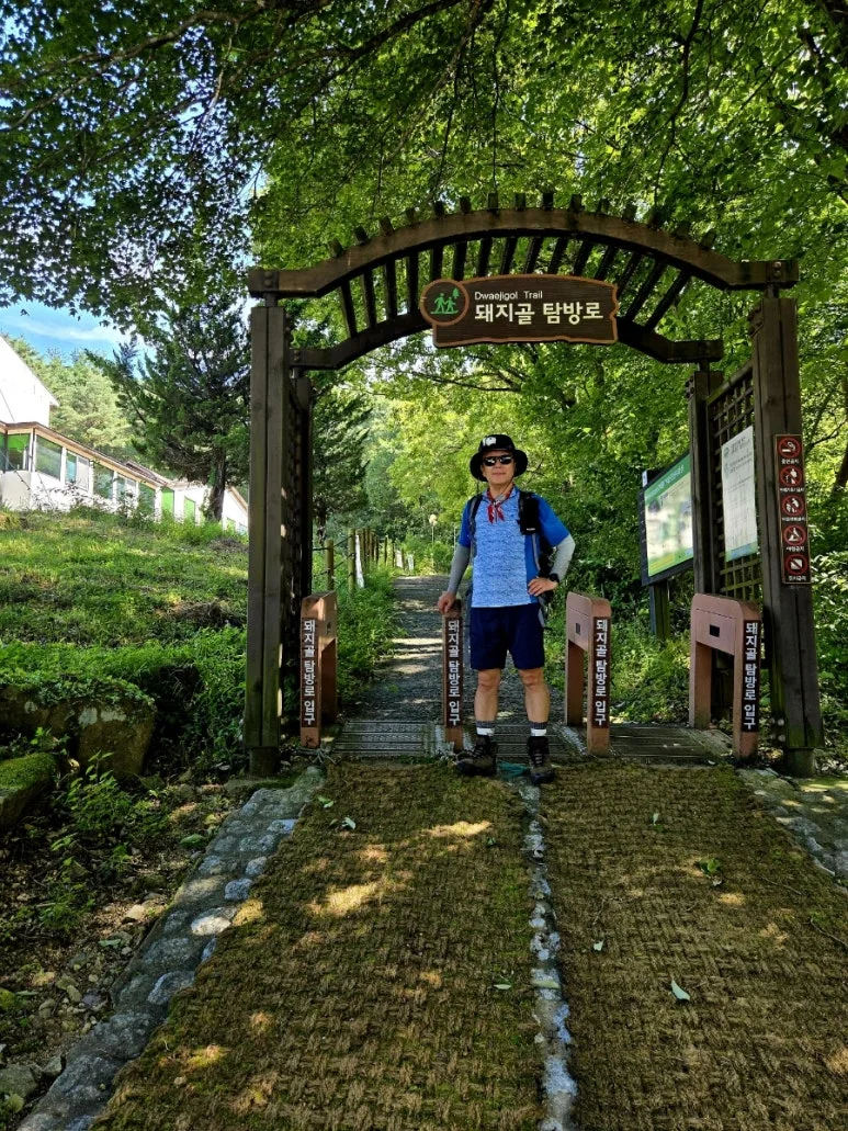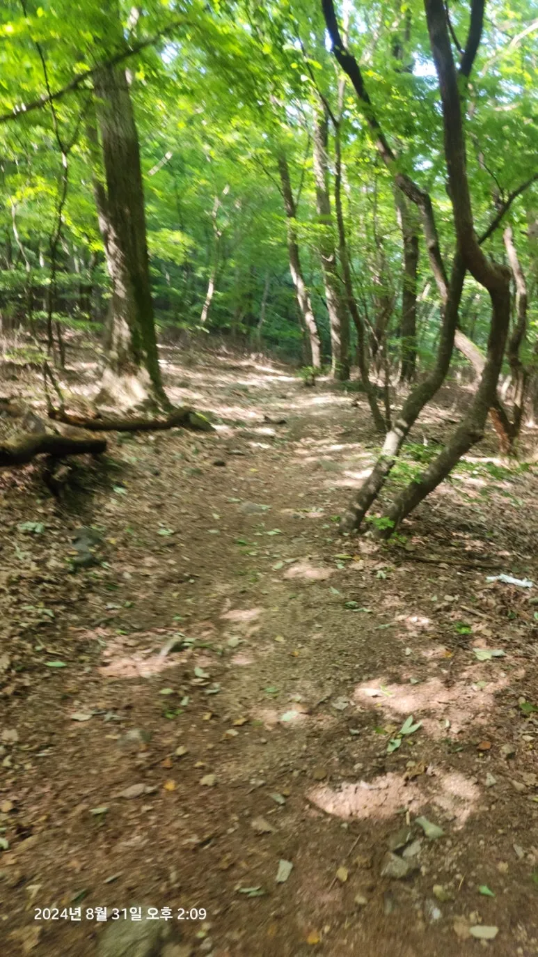 하산길은 햇볕을 막아주는 그늘진 숲길로 조망은 하나도 없었다. 하산 도중에 만난 계곡에는 가뭄 탓에 흐르는 물이 없었다. 돼지골 탐방로에 거의 다다렀을 때 산행동안 흘린 땀을 식혀 줄 정도의 시원한 물이 겨우 흐르고 있었다. 흐르는 물에 발을 담그고 머리를 감아 산행의 피로를 잠시 풀고 날머리인 돼지골 탐방로로 향했다.