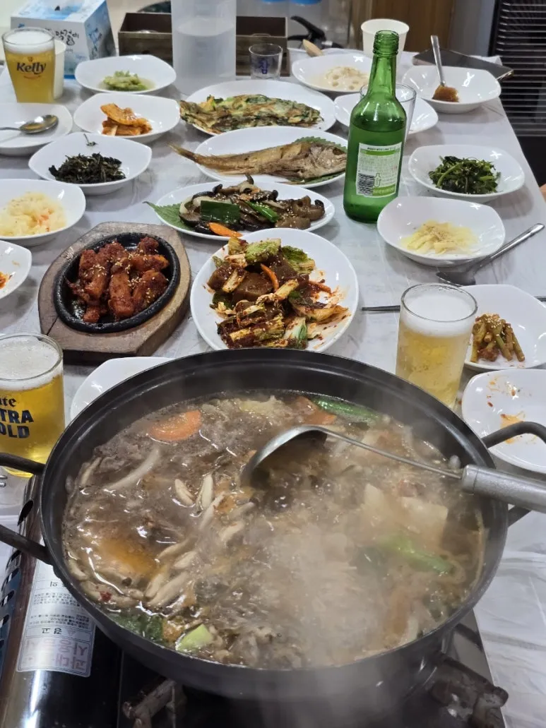 날머리인 돼지골 탐방로 출입구 더덕구이 한정식과 쇠고기 버섯전골의 푸짐한 하산식 상차림은 맛도 최고였다. 사장님의 후한 인심으로 원하는 만큼 귀한 반찬을 무한 리필해 주었다. 생선 구이를 맛나게 먹던 산우가 생선도 리필해 달라고 하니 사장님은 생선은 추가 비용을 내야 한다고 했다. 아쉬움을 남긴 채 산나물과 각종 버섯을 주로 하는 반찬을 리필받아 맛나고 즐거운 식사를 마쳤다. 주메뉴보다 반찬이 더욱 맛난 주객이 전도된 상차림이었다.