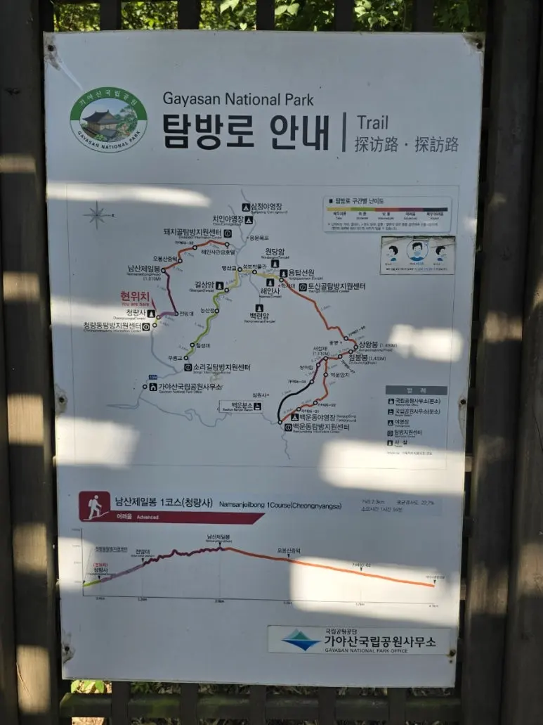 산행코스:가야산국립공원청량탐방센타-전망대-암석철계단-남산제일봉정상-전망대-돼지골탐방지원센타