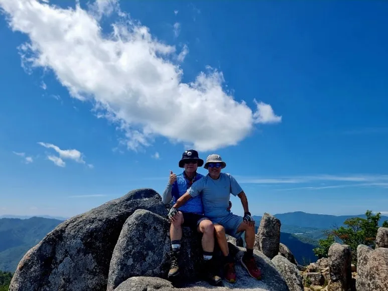 전망대에서 친한 여자 산우와 함께 전망대에서부터 본격적으로 남산제일봉의 조망이 열리기 시작하였다. 전망대에서 10여 분 걸어서 14명이 앉아 식사하기 적당한 곳에 두 팀으로 나누어서 자리를 잡고 즐거운 간식 시간을 20여 분 가졌다. 꿀떡을 챙겨 온 산행대장, 맥주를 얼려 온 산우, 교동 찐빵을 챙겨 온 부부.... 12시 30분경에 멀리 미어캣 바위를 조망할 수 있는 가위바위보 바위에 도착하였다. 가위바위보 바위 옆에는 거대한 두 개의 바위 가운데 올라서서 멋진 사진을 남길 수 있는 포토존이 있었다.