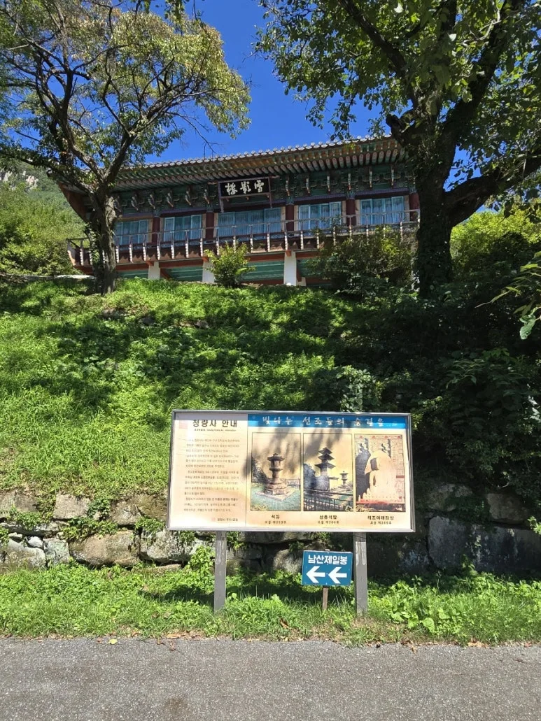 청량사로 가는 도중에 가뭄으로 저수량이 반밖에 되지 않은 황산 저수지를 지났다. 황산 저수지에서 약 10분가량 뜨거운 열기를 내뿜는 아스팔트 길을 더 올라 청량사 입구에 도착했다. 불가에서는 '남산제일봉 능선을 1,000여 개의 불상이 덮고 있는 듯해서 천불산이라고 부른다'라고 한다. 때문에 청량사를 알리는 안내석에는 '천불산 청량사'라고 새겨져 있었다.