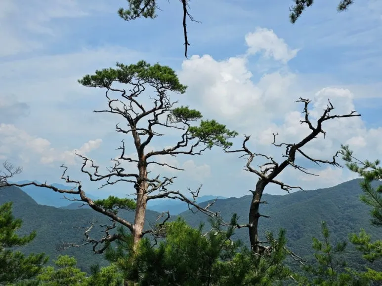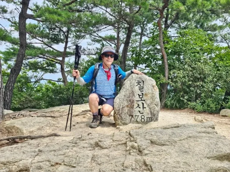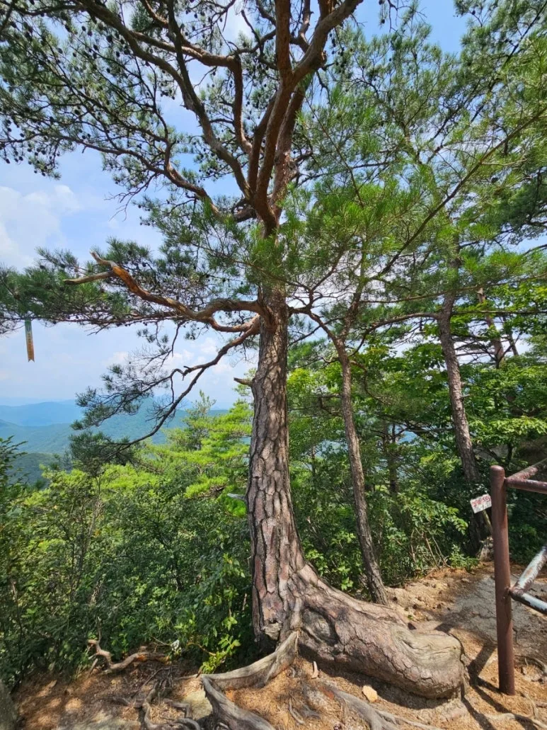 청석재 바람골에서 땀을 식히면서 청석재에서 정상까지는 600m로 계양산 야등 계단 길과 비슷한 거리였다. 정상 바로 직전 칠보산 포토존에서 사진을 남겼다. 정상 바로 아래에는 칠보산을 오랜 시간 지켜준 소나무들이 멋진 자태를 뽐내고 있었다.