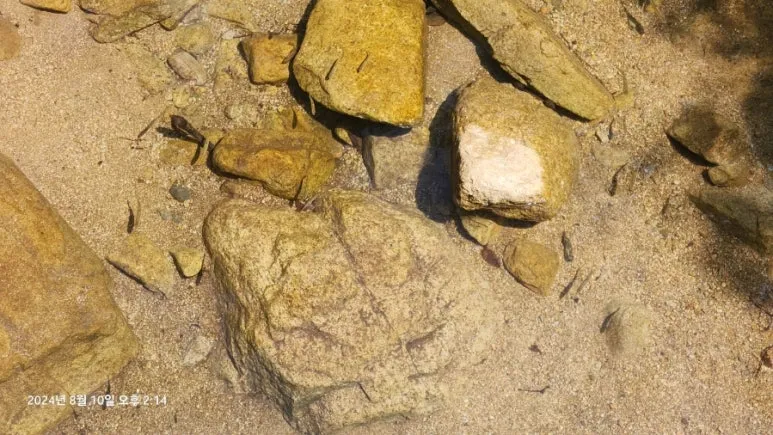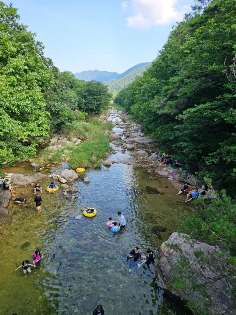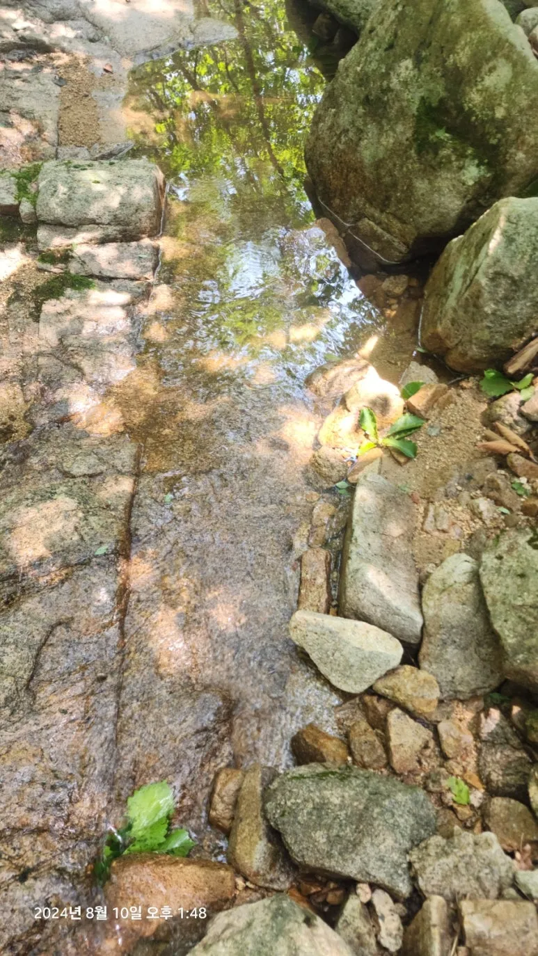 계곡에서 물놀이를 즐기는 피서객 칠보산 정상으로 연결되는 등산로 곳곳에 데크 계단도 있었지만 오솔길로 잘 정비되어 있었다. 칠보산의 울창한 숲 덕분에 강한 햇볕의 뜨거움을 피할 수 있었고 수량은 많지 않았지만 등산로 오른쪽에 흐르는 계곡물에 땀을 식힐 수도 있었다. 우리와 달리 중간에 휴게소를 둘러 아침 식사를 하지 않은 선발대(주산, 벼락바위, 사네가자, 커여운 토끼)는 허기 때문에 더 이상 산행을 할 수 없다고 하여 간단히 간식 시간을 가졌다. 나와 우공은 일행들이 간식을 즐기는 시간에 먼저 정상으로 향했다.