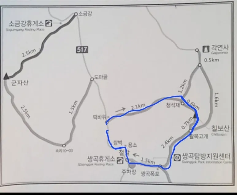 등산코스: 떡바위 - 청석재 - 칠보산 정상 - 쌍곡폭포 - 쌍곡계곡 - 절말주차장