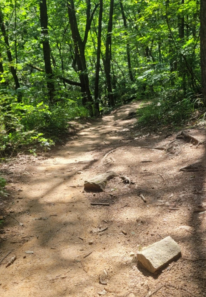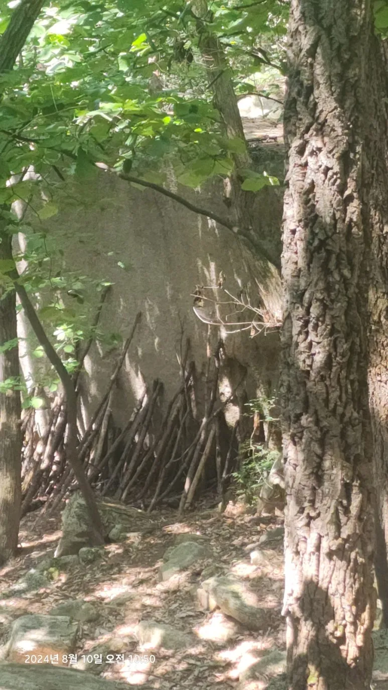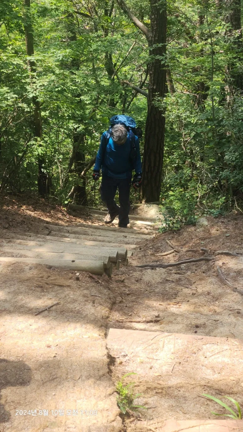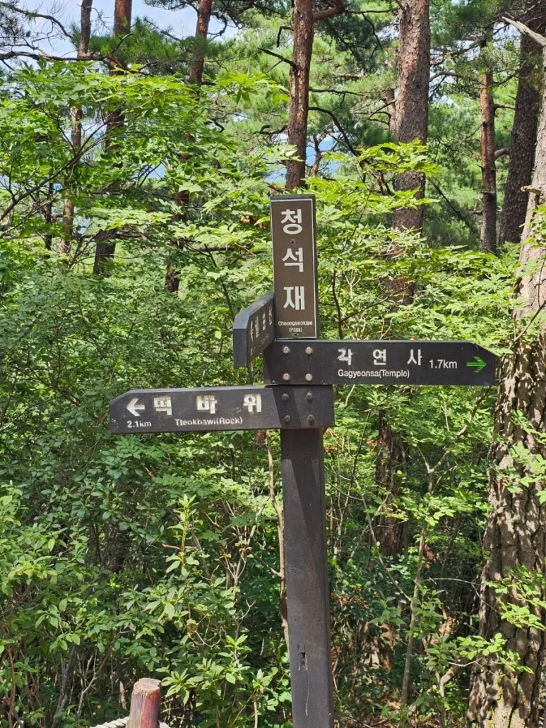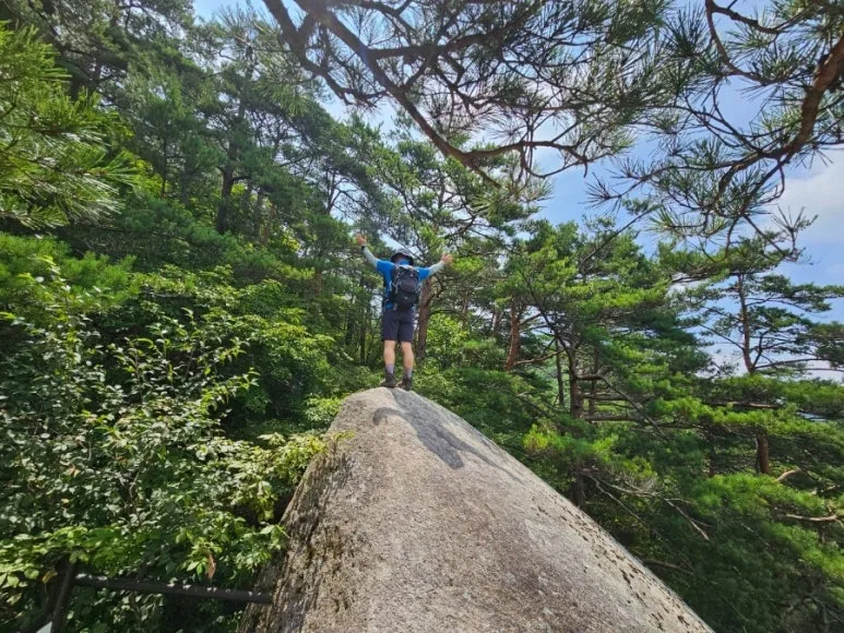 바위가 쓰러지지 않도록 나무 버팀목을 받쳐 놓았다. 7월 마지막 주부터 8월 첫 번째 주까지 무리하게 산행(일본 알프스 원정 산행, 무박 대간 산행, 두 번의 계양산 야등)을 강행하여 입술이 두 군데나 터진 우공은 산행을 무척 힘겨워했다. 우공보다 먼저 청석재에 도착하여 휴식을 취하며 우공을 기다려도 우공은 오지 않았다. 한참을 지나서야 우공이 청석재에 모습을 보였는데 우공은 땅만 쳐다보면서 힘겹고 무겁게 발걸음을 옮기며 계단을 올랐다.