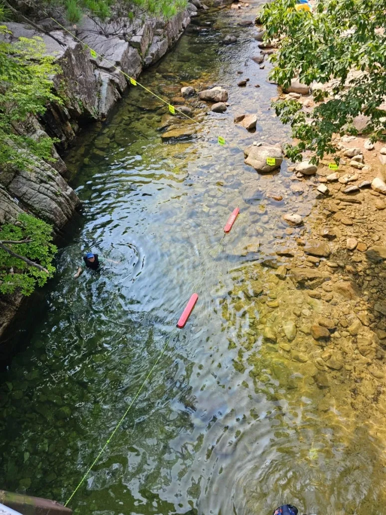 점심 식사 시간 절말방향으로의 하산길은 등린이들도 편안하게 트레킹 할 수 있는 정도의 오솔길로 이어졌다. 하산길 곳곳의 계곡에서 맑은 물에서만 산다는 버들치들도 만날 수 있었다. 비교적 수량이 풍부한 곳에서는 많은 사람들이 알탕을 즐기고 있었다. 우리 일행은 점심 식사를 하면서 계곡 상류에서 시원한 물에 땀을 식힌 것으로 알탕을 대신하고 불광동에서의 뒤풀이를 위해서 서둘렀다.