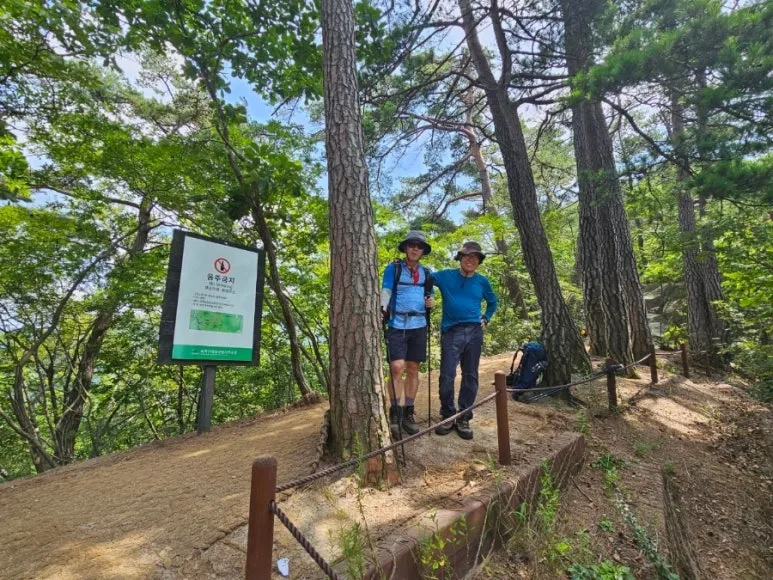 하산길 수량은 많지 않지만 맑은 물이 고인 널찍한 바위 위에 자리를 펴고 각자 준비해 온 도시락과 간식, 기호음료를 나누어 먹으며 정담을 나누었다. 주산님의 산행 무용담은 끝이 없었다. 산타리아님은 커토님이 싸 온 두부 부침이 1cm도 안되게 너무 얇다고 면박을 주며 줄자를 선물해 줄 테니 다음에는 1cm 이상의 두께로 두부 부침을 해오라고 했다. 벼락바위님의 김치찌개에는 참치가 너무 적다며 주산님이 역시 면담을 주니 벼락바위님은 참치 통조림 한 통을 다 넣은 것이라고 맞받아쳤다. 우공은 커토님이 예전에 산행 때 배낭에 담은 소주 두 병이 배낭에서 새어 나오자 물이 샌 것이라고 했었다는 옛이야기를 하면서 커토님이 소주를 무척이나 좋아한다고 했다. 오랜 시간 함께 산행하면서 쌓은 정이 깊기에 스스럼없이 나눌 수 있는 이야기였다. 커토님은 북한산을 뛰어다니는 날다람쥐처럼 등력이 우수한 여전사라고 하였다.