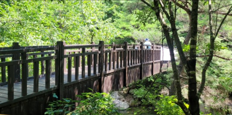 등산로 입구 도로 상태 자동차로 가득 찬 도로를 걸어서 오늘의 들머리에서 단체 사진을 남기고 본격적인 산행을 시작하였다. 들머리 입구에 들어서자마자 데크 다리가 우리를 맞아 준다. 데크 다리 아래에는 많은 피서객들이 계곡물에서 더위를 식히며 물놀이를 즐기고 있었다. 산타리아님께서 하산길에 계곡에서 무더위 산행의 흘린 땀을 식힐 것이라는 말에 시원한 알탕을 한껏 기대하며 본격적인 산행을 시작했다.