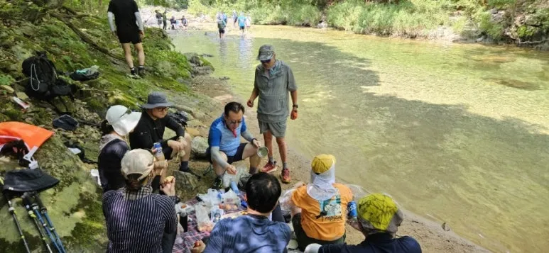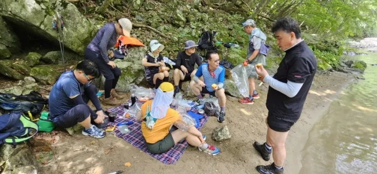 즐거운 간식 시간 자연 그대로의 상태를 거의 간직한 아침가리계곡은 한 번 진입하면 중간에 빠지는 길은 없고 계곡과 계곡 옆 숲길을 따라 걷고 또 걸어야만 최종 목적지인 진동 마을에 도착할 수 있었다.