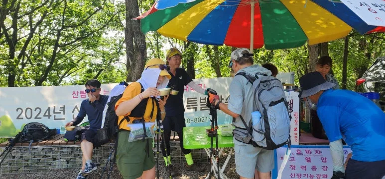 약 3Km의 임도길을 걸어서 언덕 정상에 도착하자 간이매점이 흠뻑 땀 흘린 우리를 반겼다. 자신의 의견에 따라 힘들게 언덕 정상까지 산행해서 미안하다고 언덕 정상의 매점에서 일행들에게 시원한 막걸리와 오미자차를 한 잔씩 선물하였다. 인심은 아내가 쓰고 계산은 남편에게 시켰다.