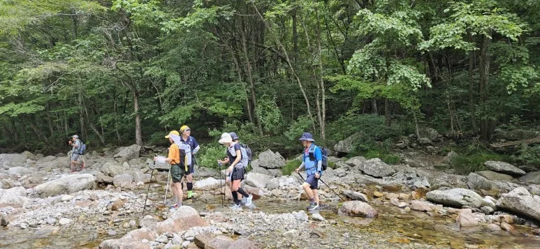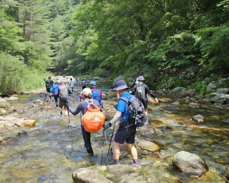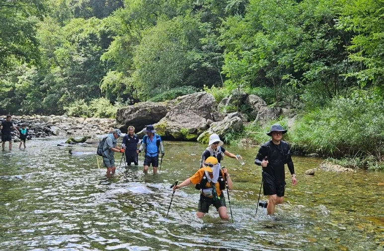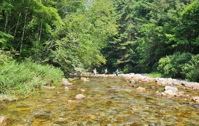 아침가리계곡 트레킹 안내문 아침가리계곡 트레킹 출발점은 숲길로 시작된다. 숲길을 조금 걸으면 계곡을 만나게 되는데 약 6.3Km로 이어지는 긴 계곡의 트레킹은 계곡물속과 계속 옆 숲길을 교대로 걸으면서 자연 풀장에서 동심으로 돌아가 물놀이를 즐기면서 진행되었다. 도심의 기온은 35도를 육박하고 있었으나 트레킹 당일 계곡의 온도는 27도 정도로 쾌적하였다.