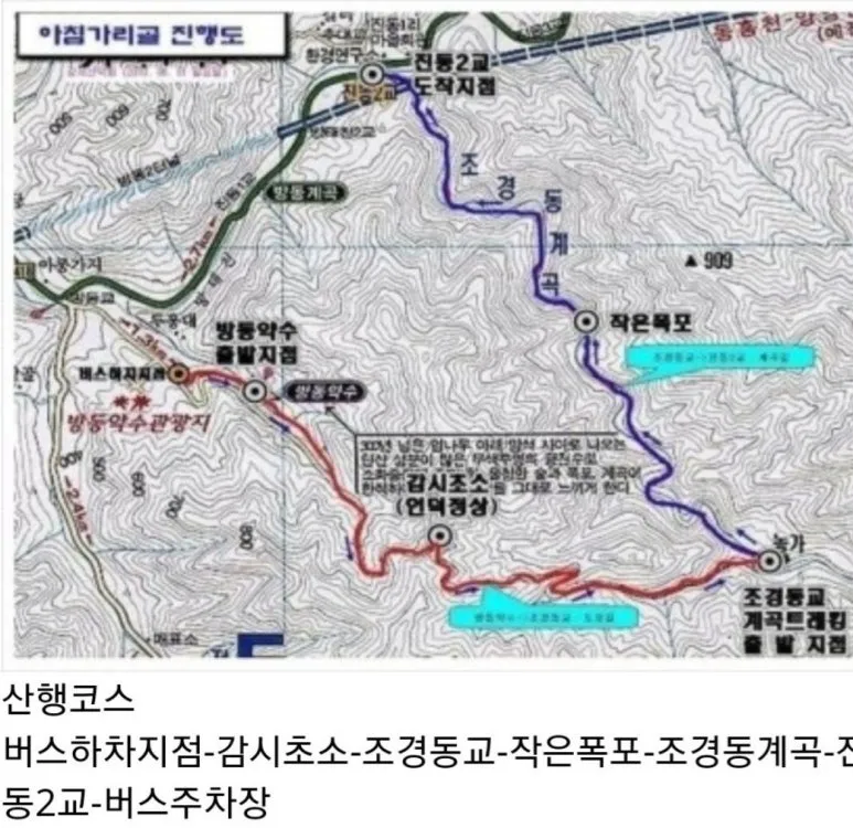 산트레킹 코스 : 버스하차지점 - 언덕 정상 - 조경 동교 - 작은 폭포- 조경동 계곡 - 진동 2교 - 버스 주차장