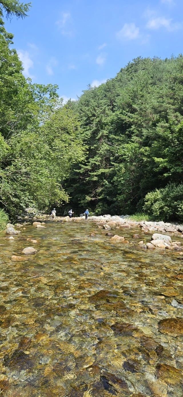 하늘은 푸르고 아침가리 계곡 물은 맑았다.