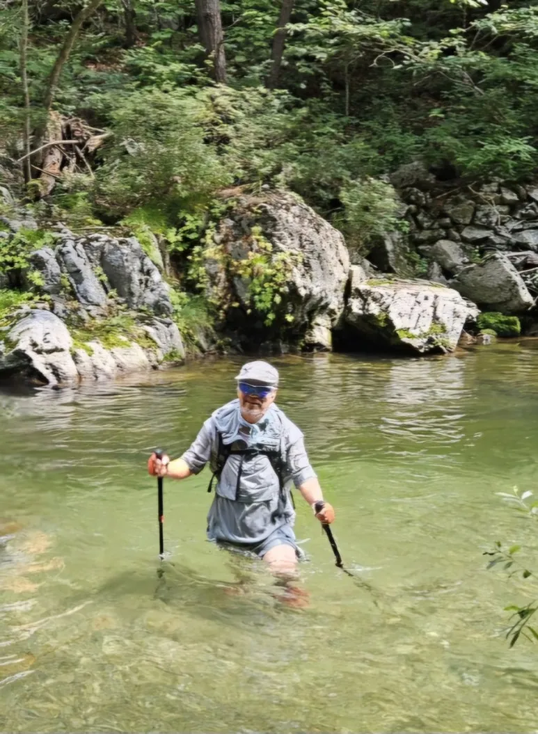 종원이가 계곡 물을 가르며 걷고 있다.