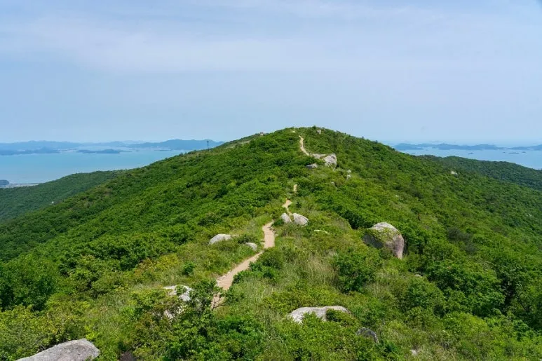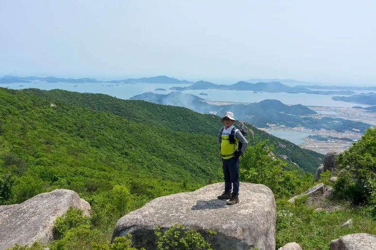 환희대에 오르다. 환희대에서 연대봉으로 이어지는 능선 길은 소백산 길을 빼닮은 아름다운 길이었다. 소백산과 다른 점은 양쪽으로 뚫려 있어 다도해를 조망할 수 있다는 것이었다. 사량도 능선길에서 통영 앞바다와 다도해를 봤던 기억이 떠올랐다. 그늘 없이 길게 펼쳐진 능선길을 따라 가을이면 은빛 억새가 장관을 이룬다고 한다.
