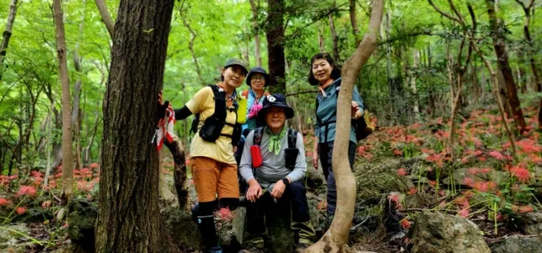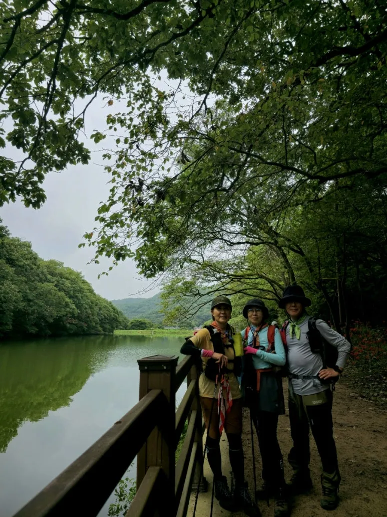 하산길에 빨간색 자태의 상사화는 아니지만 아쉬운 대로 거의 만개한 연분홍빛의 상사화를 볼 수 있었다. 불갑산 호랑이가 마셨다는 물인 호랑이 폭포를 지나 상사화 군락지에서 청라산악회 미녀삼총사를 다시 만나서 함께 상사화와 불갑사 저수지를 배경으로 사진을 남겼다.